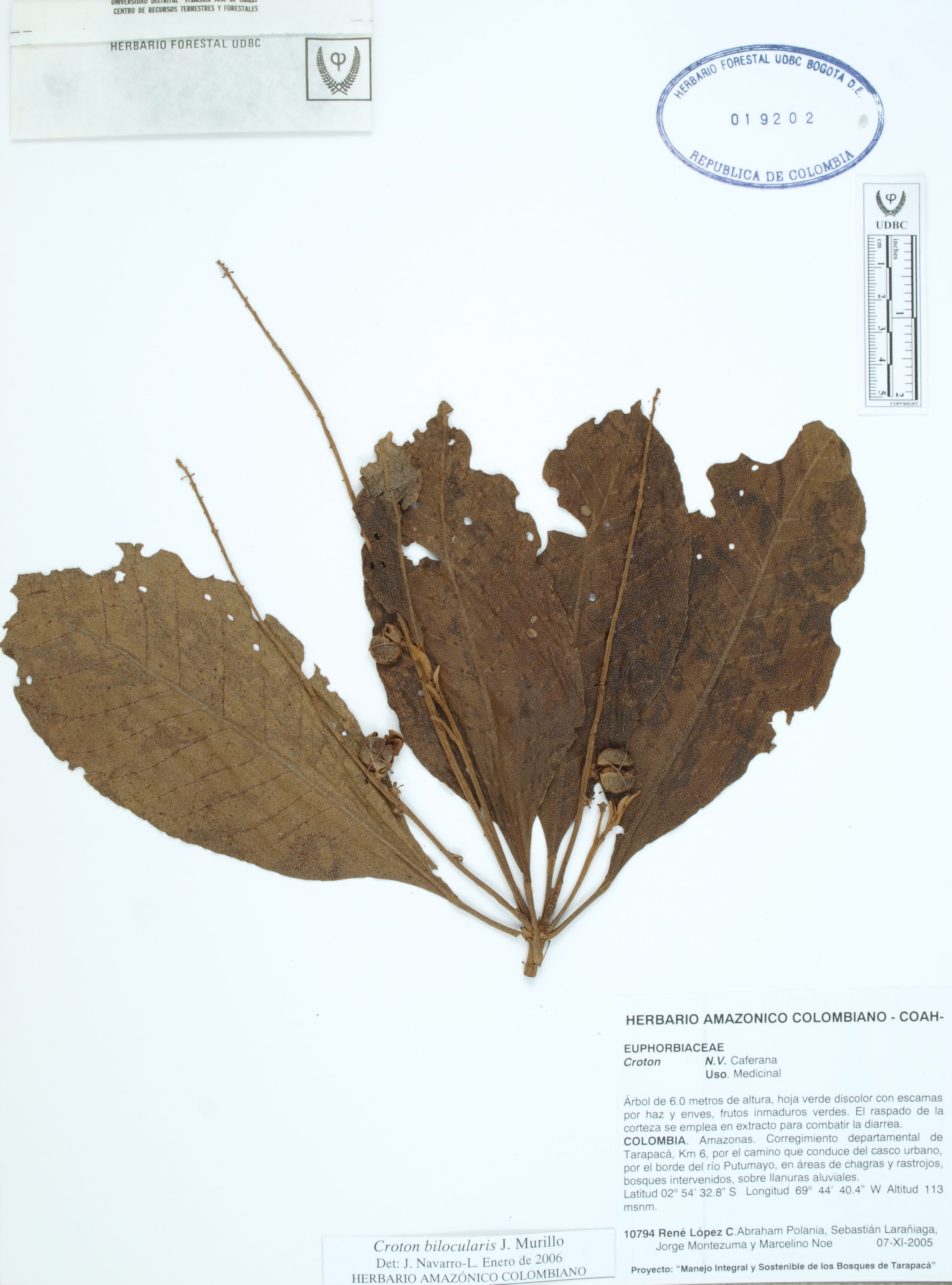 Fotografía del ejemplar López, R. 10794, determinado como Croton bilocularis en el año 2006