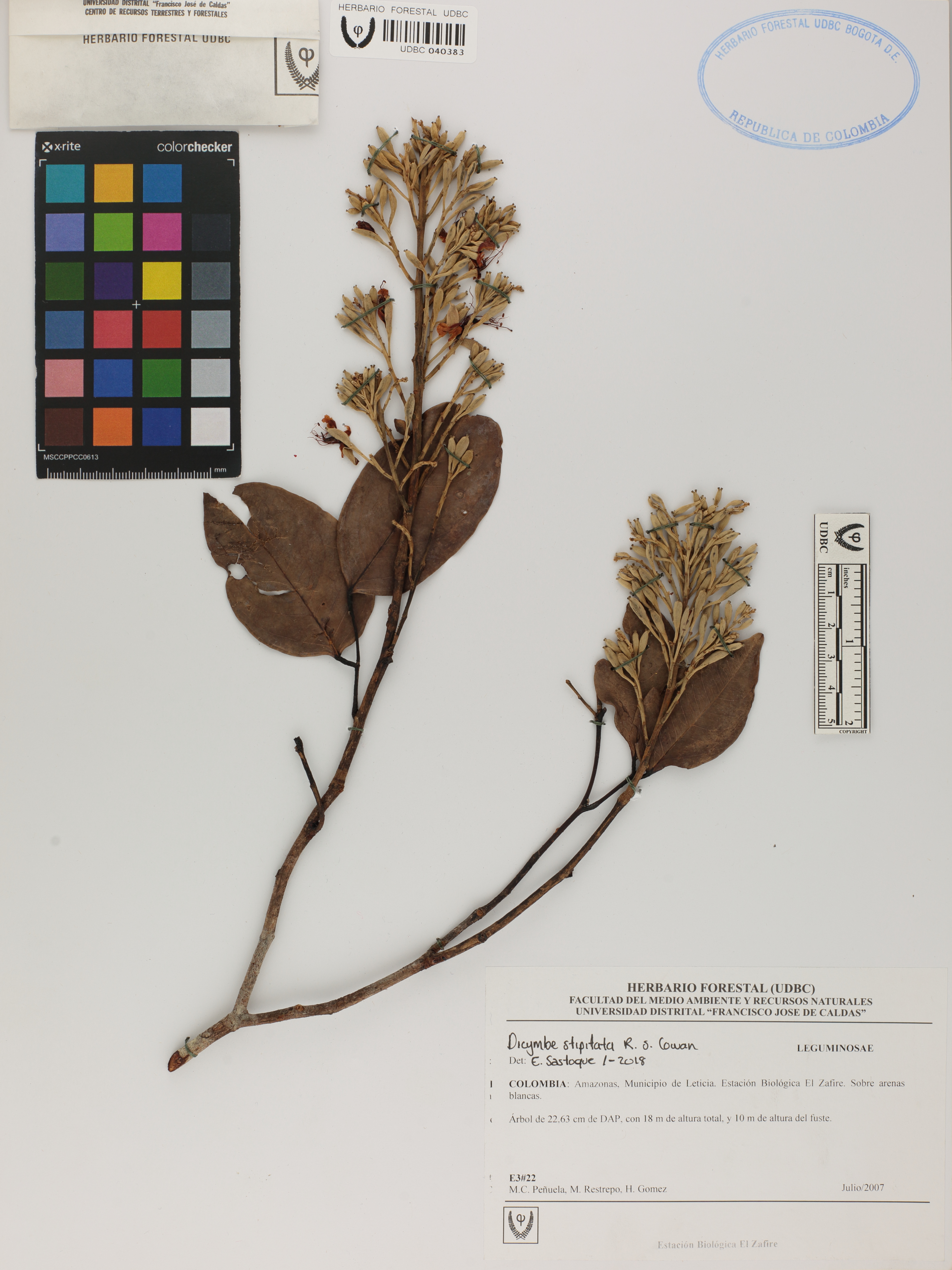 Fotografía del ejemplar Peñuela, M. E3#22, determinado como Dicymbe stipitata en el año 2018