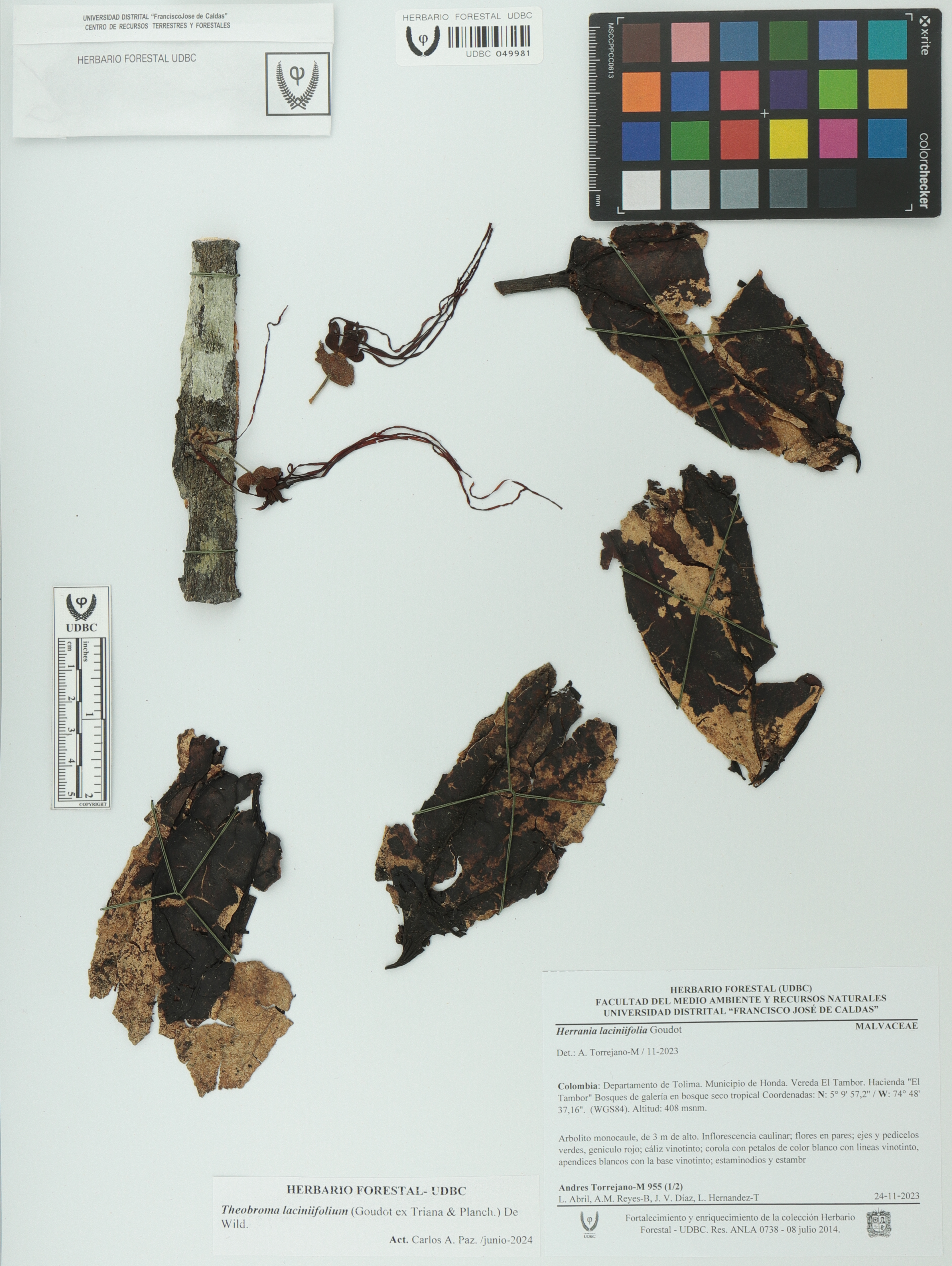 Fotografía del ejemplar Torrejano-M., A. 955, determinado como Theobroma laciniifolium en el año 2023