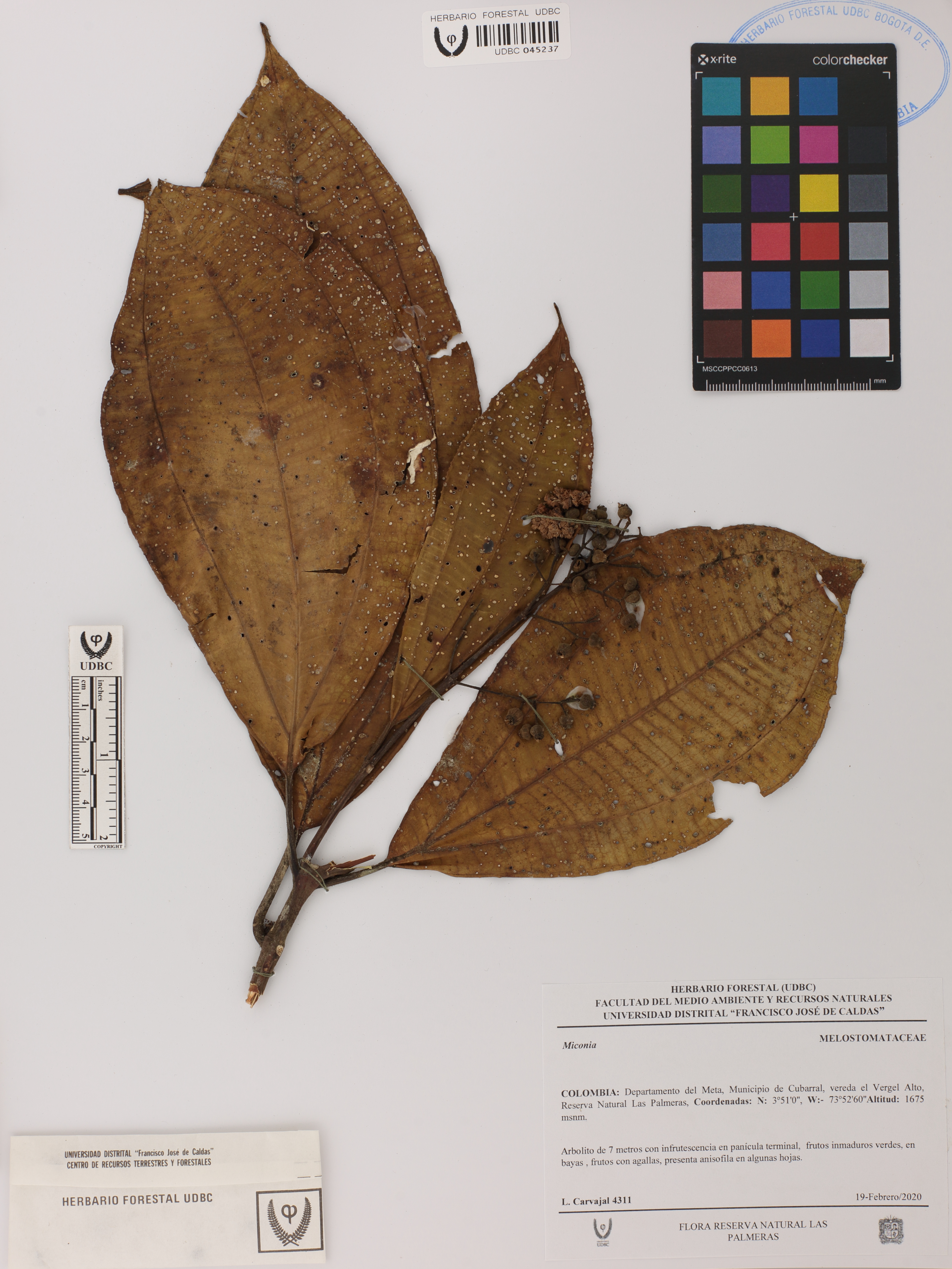 Fotografía del ejemplar Carvajal, L. 4311, determinado como Miconia sp.