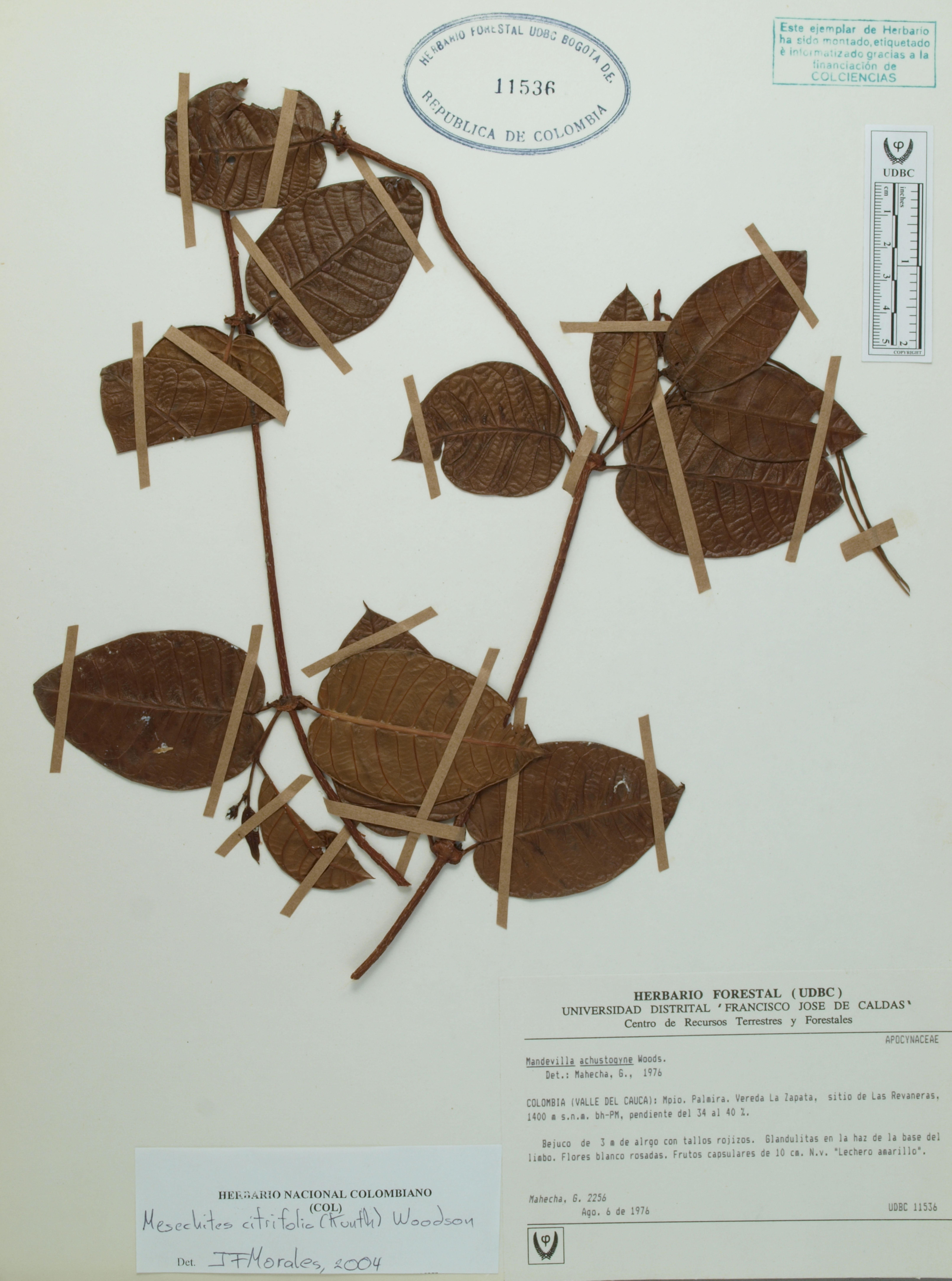 Fotografía del ejemplar Mahecha, G. 2256, determinado como Mesechites citrifolius en el año 2004
