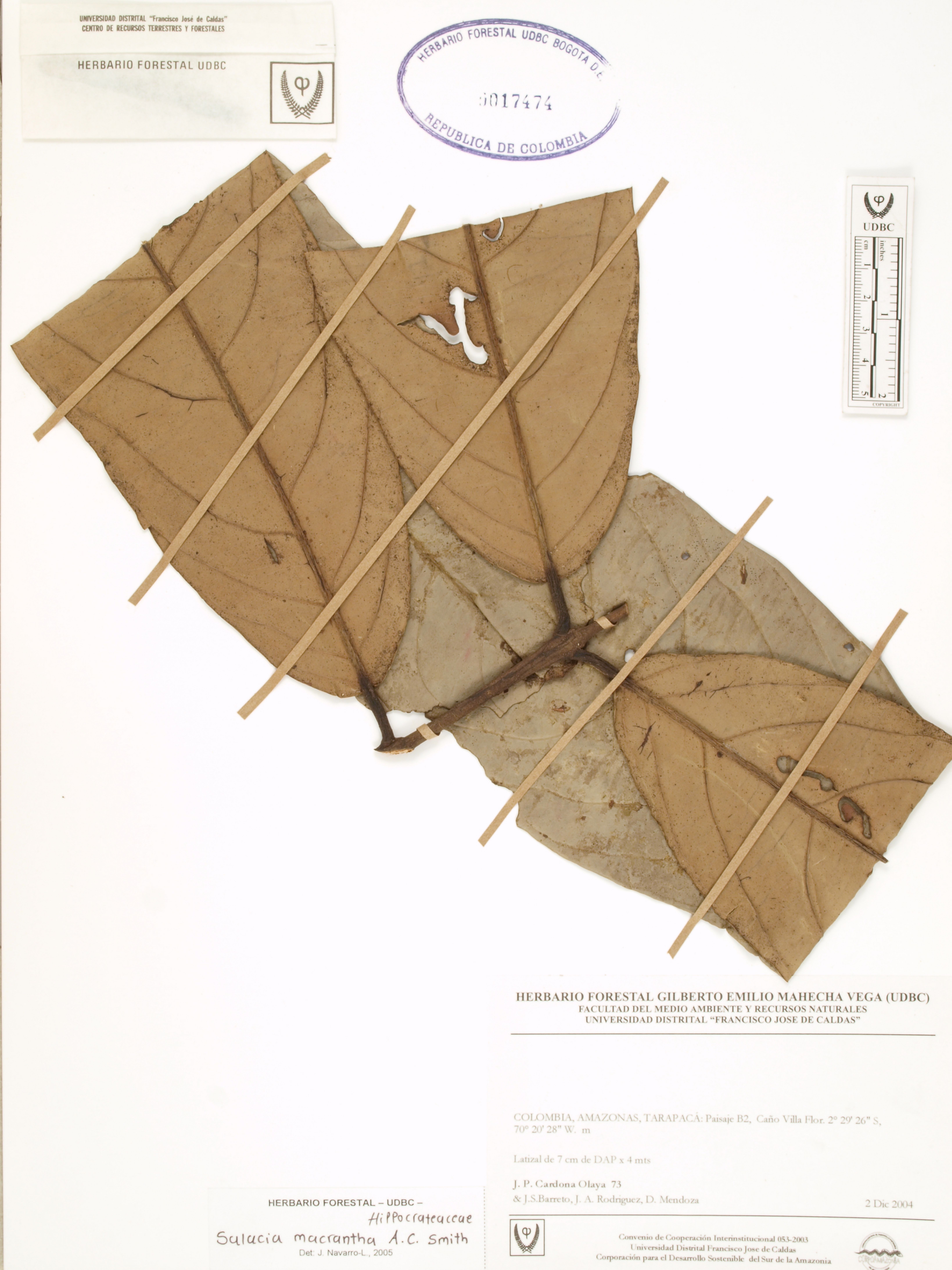 Fotografía del ejemplar Cardona, J. 73, determinado como Salacia macrantha en el año 2005