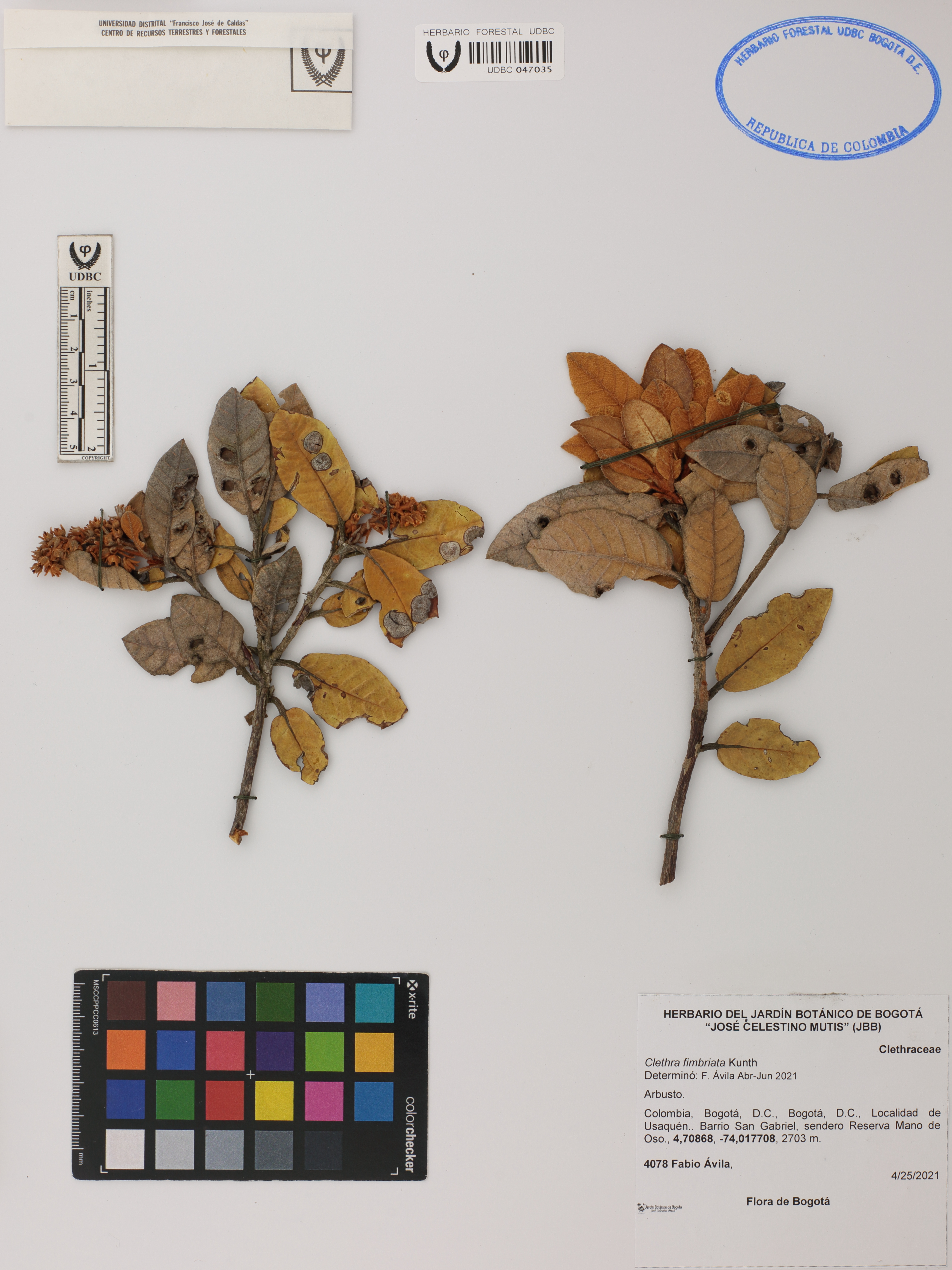 Fotografía del ejemplar Ávila, F. 4078, determinado como Clethra fimbriata en el año 2021