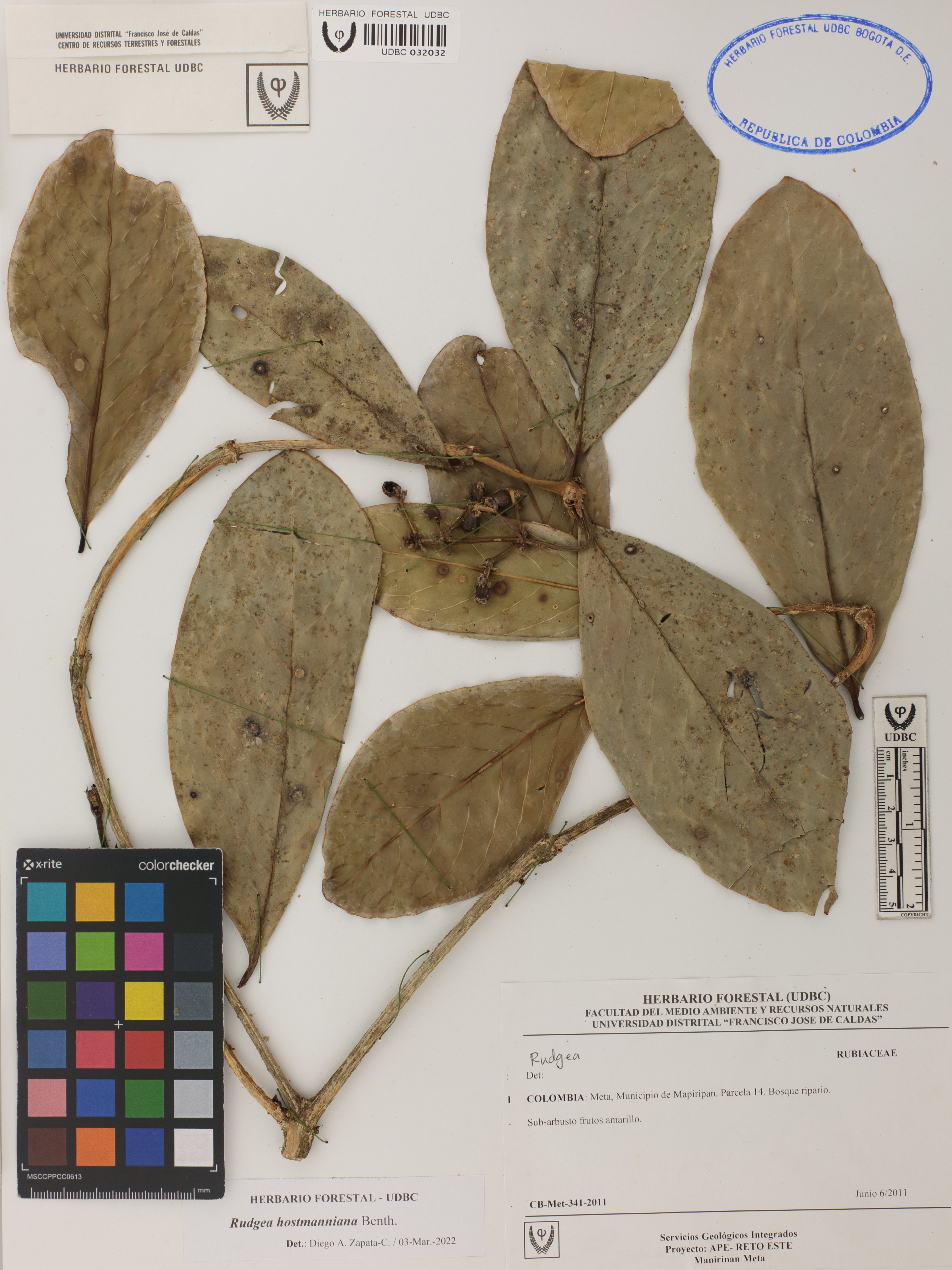 Fotografía del ejemplar SD 341, determinado como Rudgea hostmanniana en el año 2022