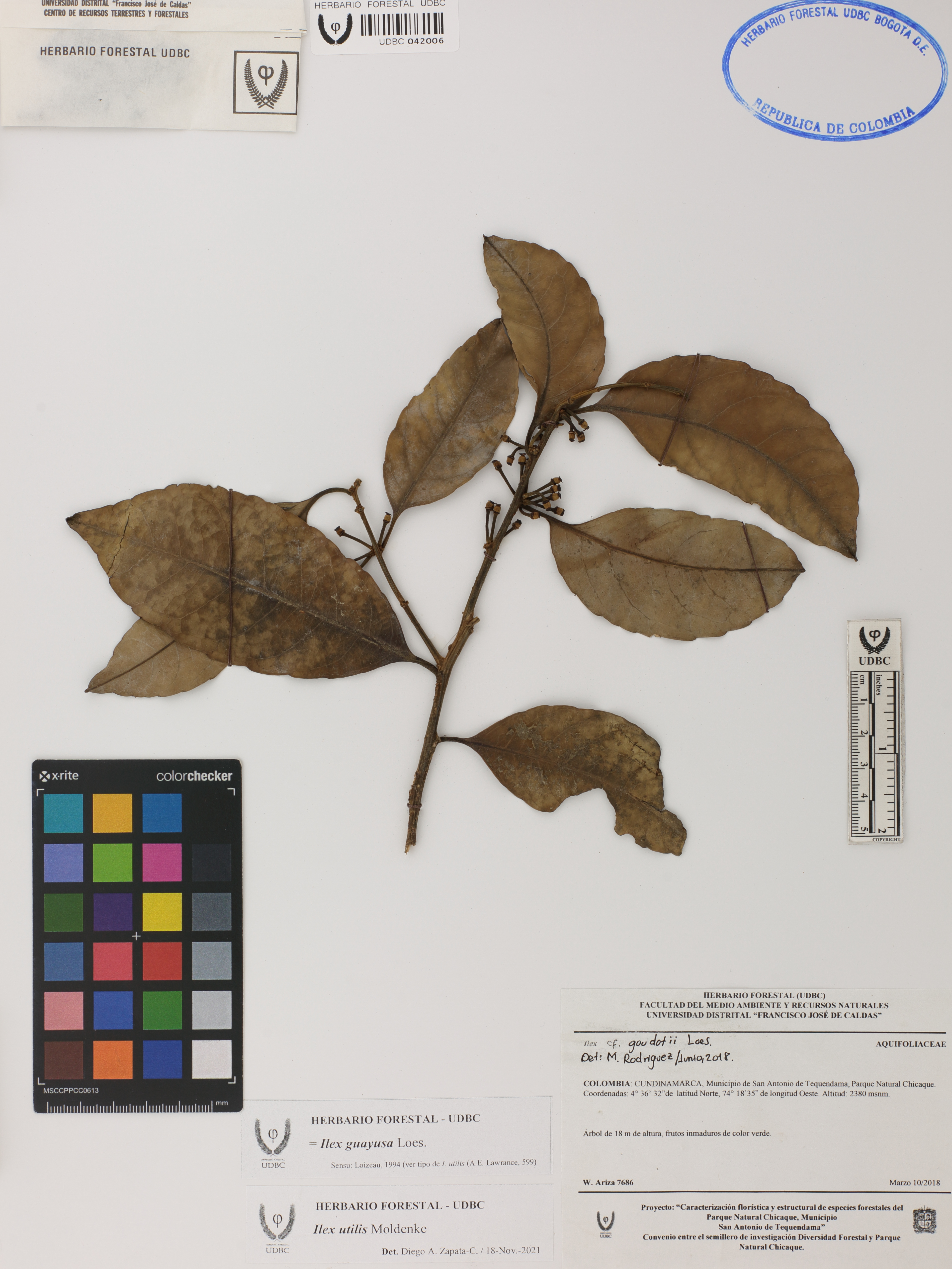 Fotografía del ejemplar Ariza, W. 7686, determinado como Ilex guayusa en el año 2021