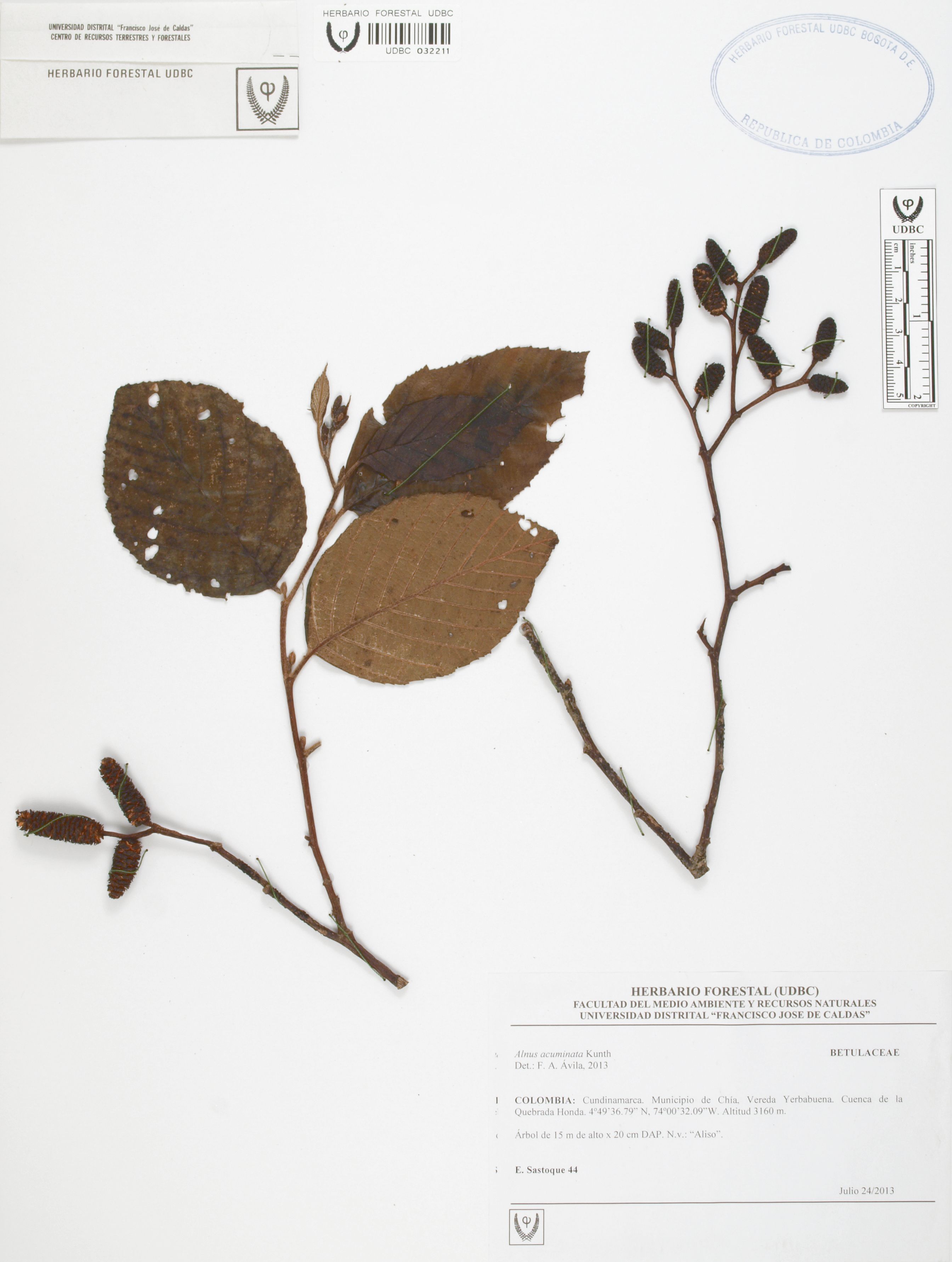 Fotografía del ejemplar Sastoque, E. 44, determinado como Alnus acuminata en el año 2013