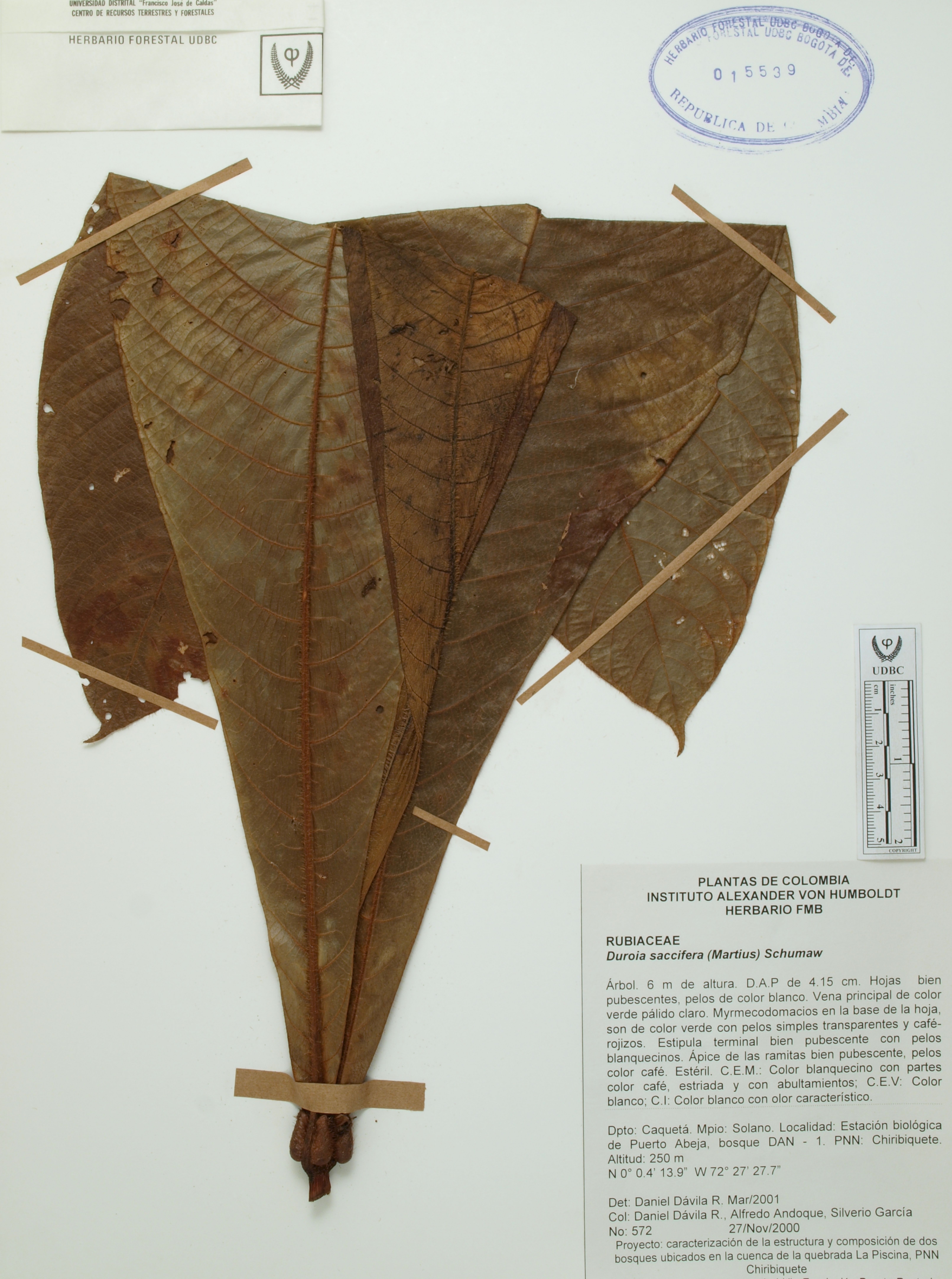 Fotografía del ejemplar Dávila, D. 572, determinado como Duroia saccifera en el año 2001