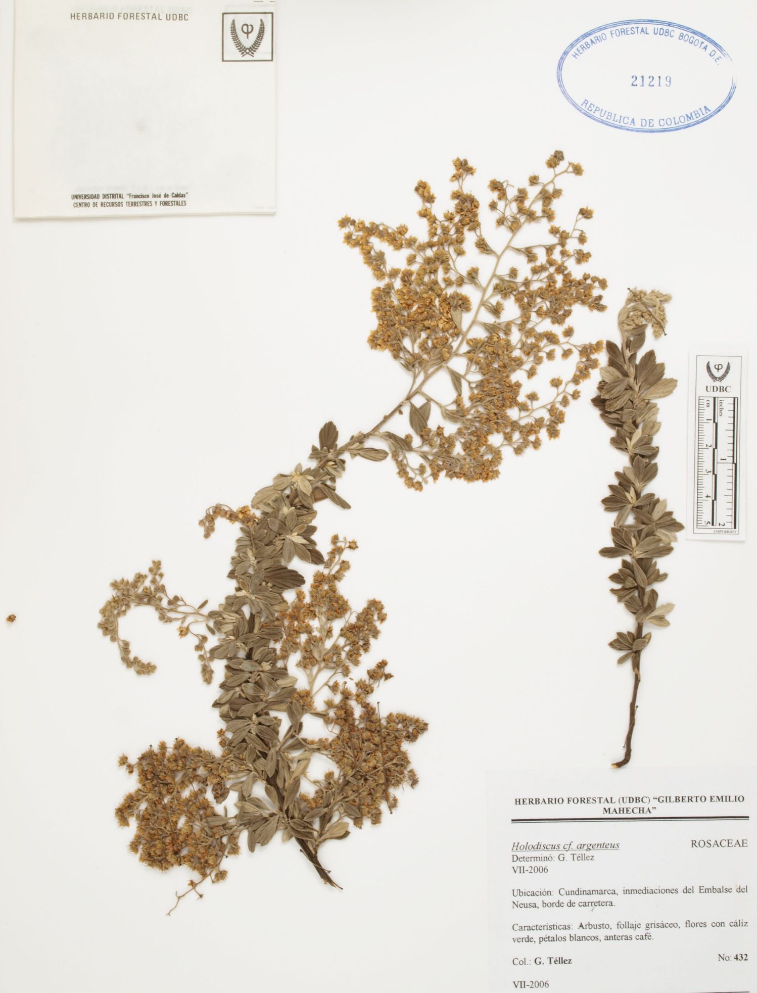 Fotografía del ejemplar Téllez, G. 432, determinado como Holodiscus argenteus en el año 2006
