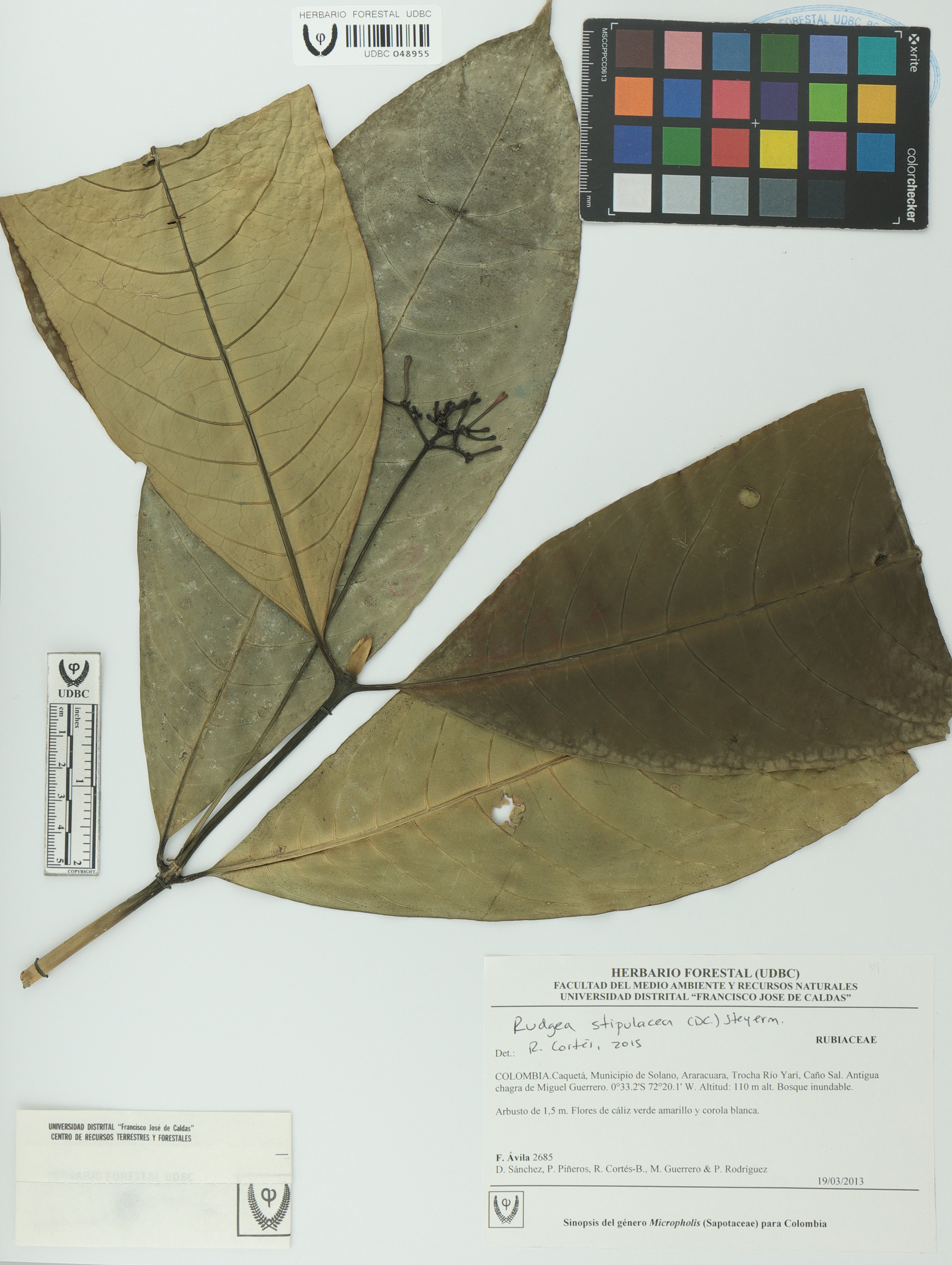Fotografía del ejemplar Ávila, F. 2685, determinado como Rudgea stipulacea en el año 2015