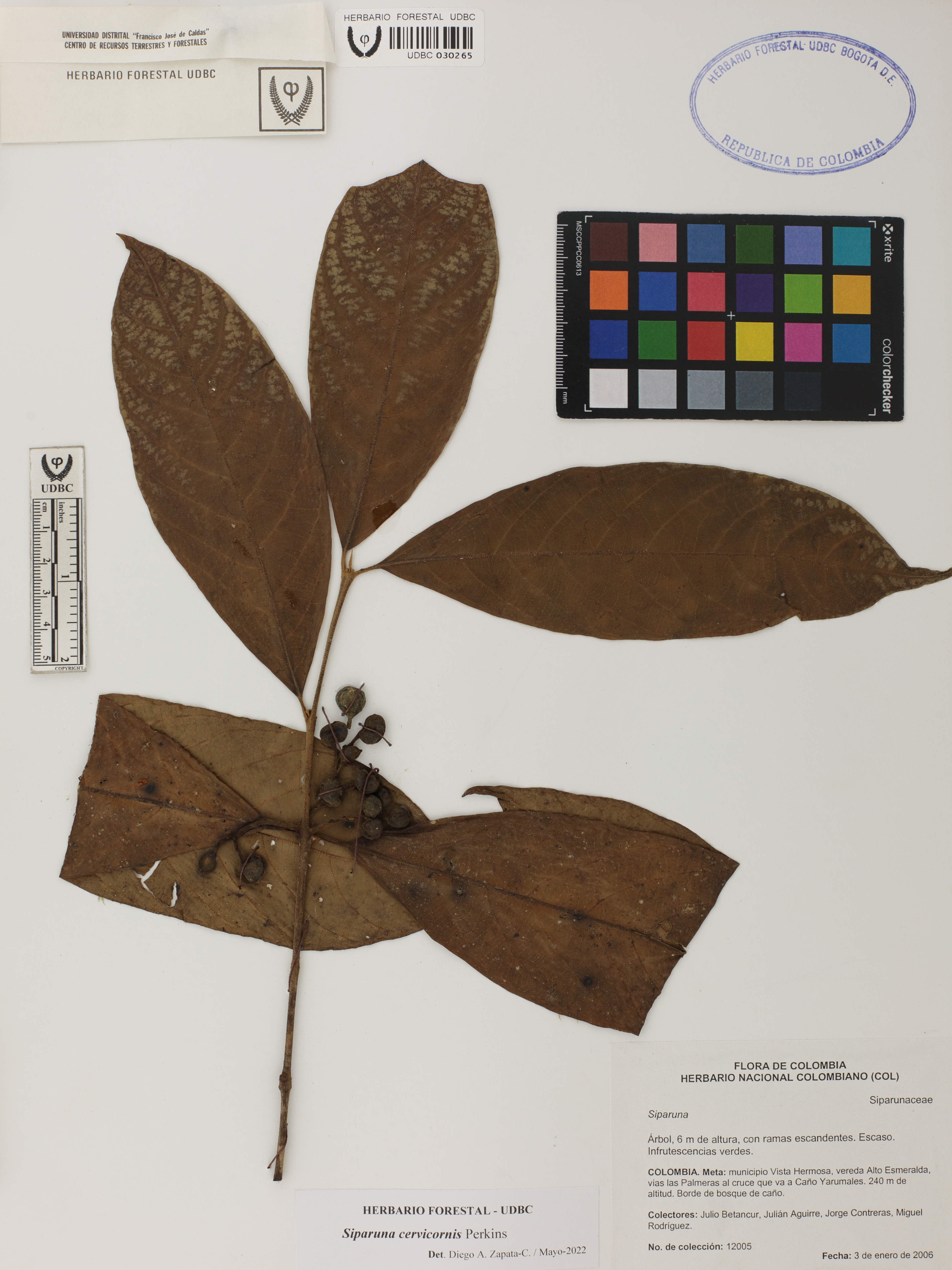 Fotografía del ejemplar Betancur, J. 12005, determinado como Siparuna cervicornis en el año 2022