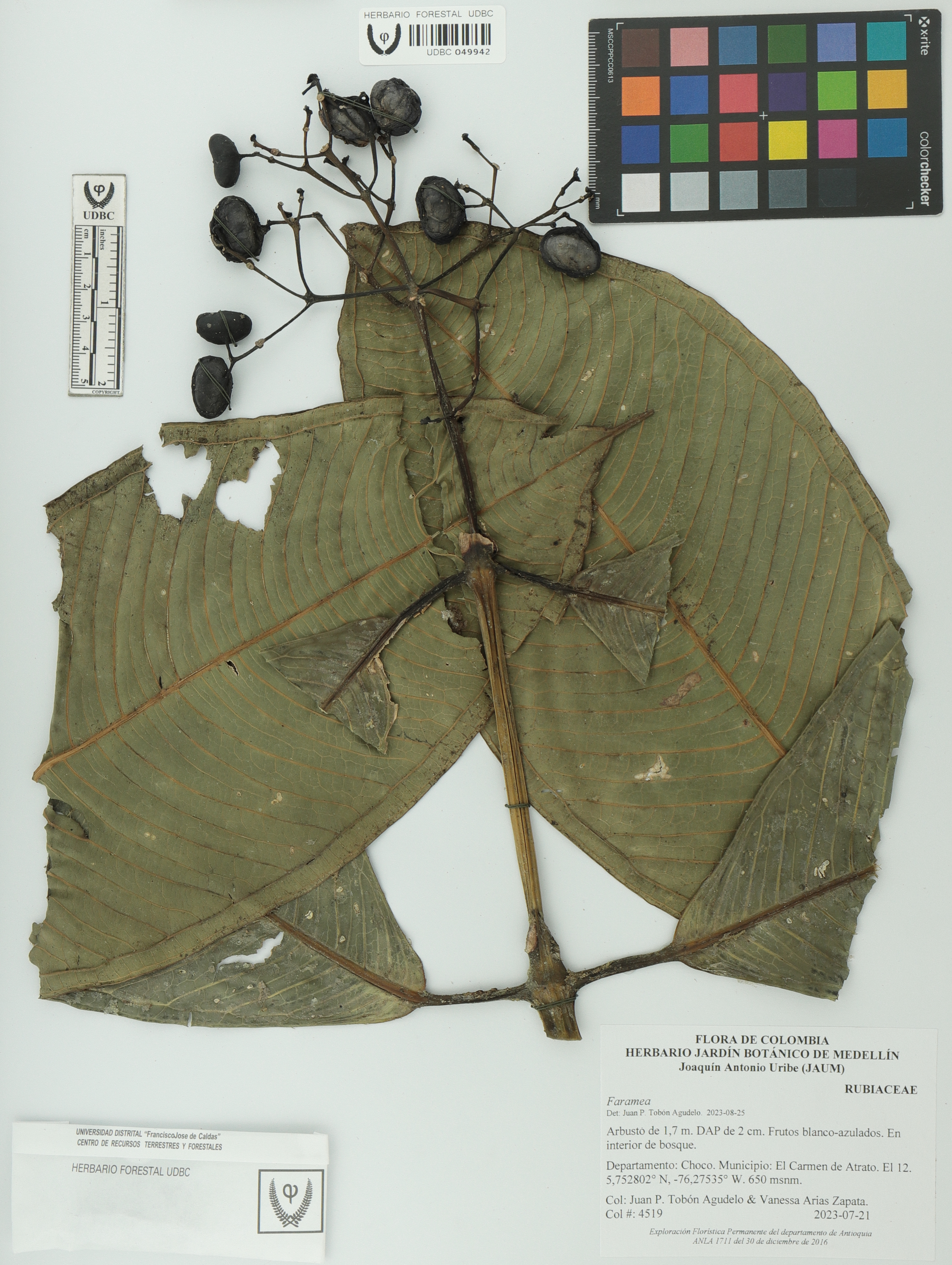 Fotografía del ejemplar Tobón-Agudelo, J. 4519, determinado como Faramea grandifolia en el año 2024