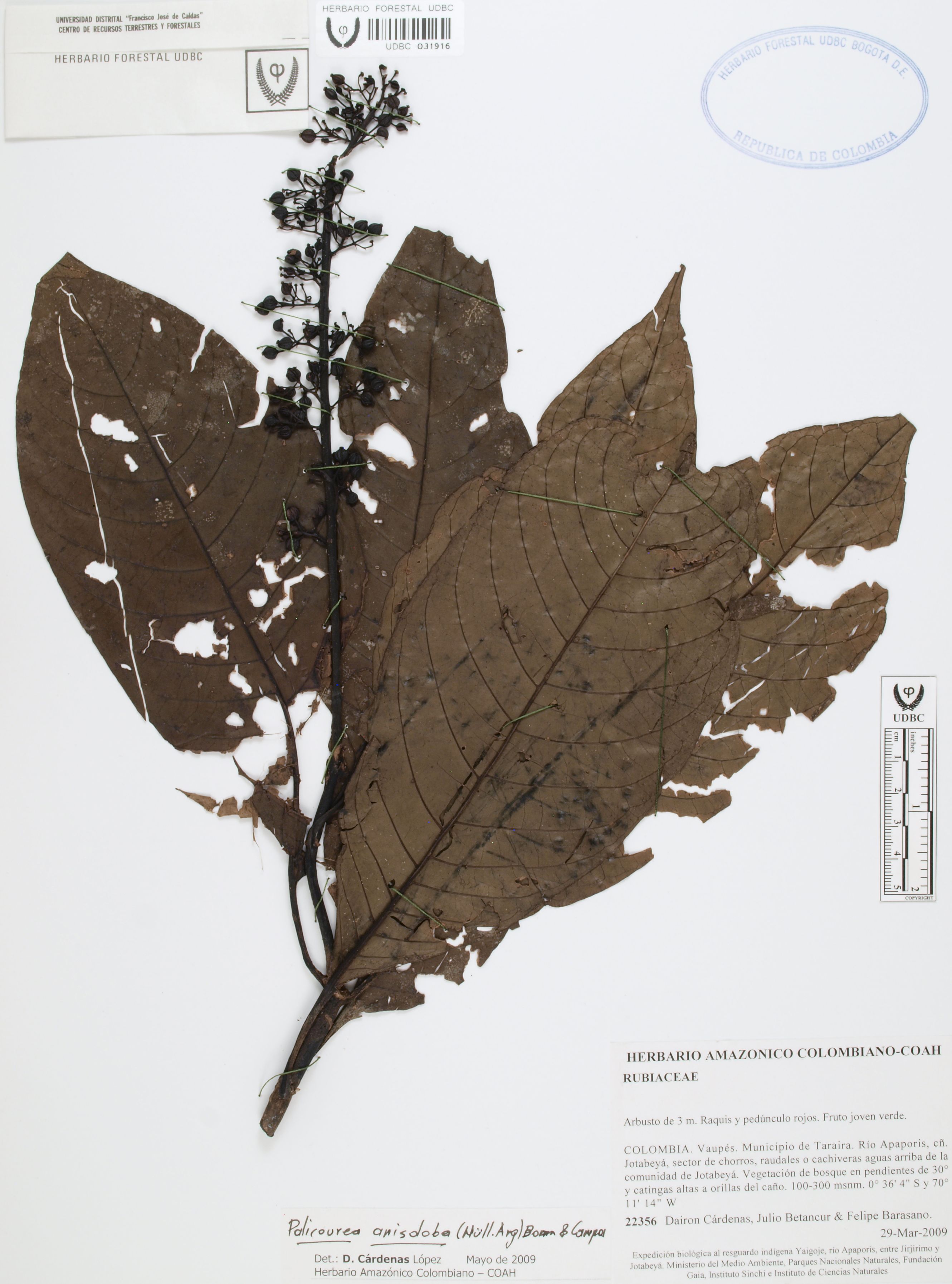 Fotografía del ejemplar Cárdenas, D. 22356, determinado como Palicourea anisoloba en el año 2009