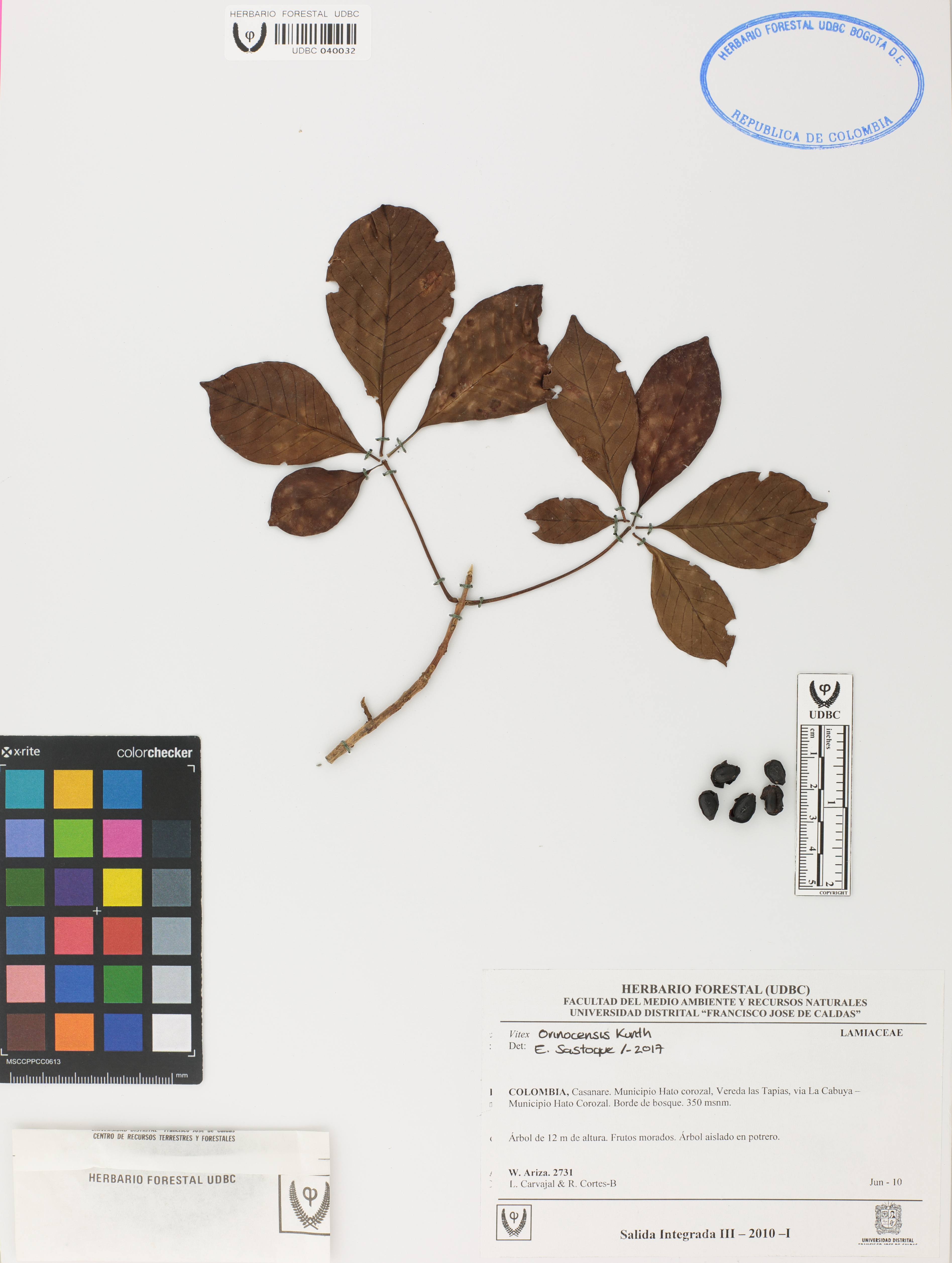 Fotografía del ejemplar Ariza, W. 2731, determinado como Vitex orinocensis en el año 2017