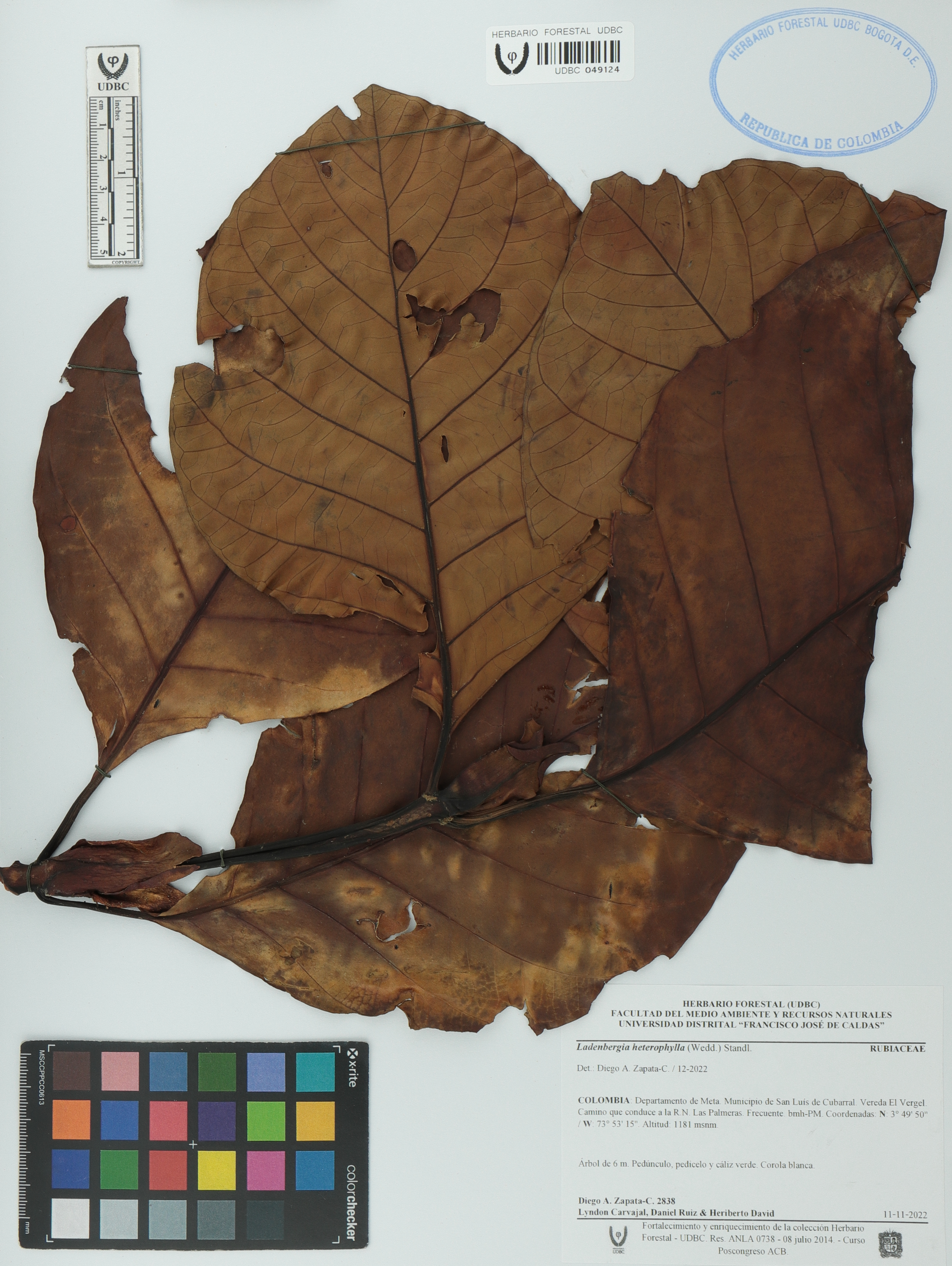 Fotografía del ejemplar Zapata-C., D. 2838, determinado como Ladenbergia heterophylla en el año 2022