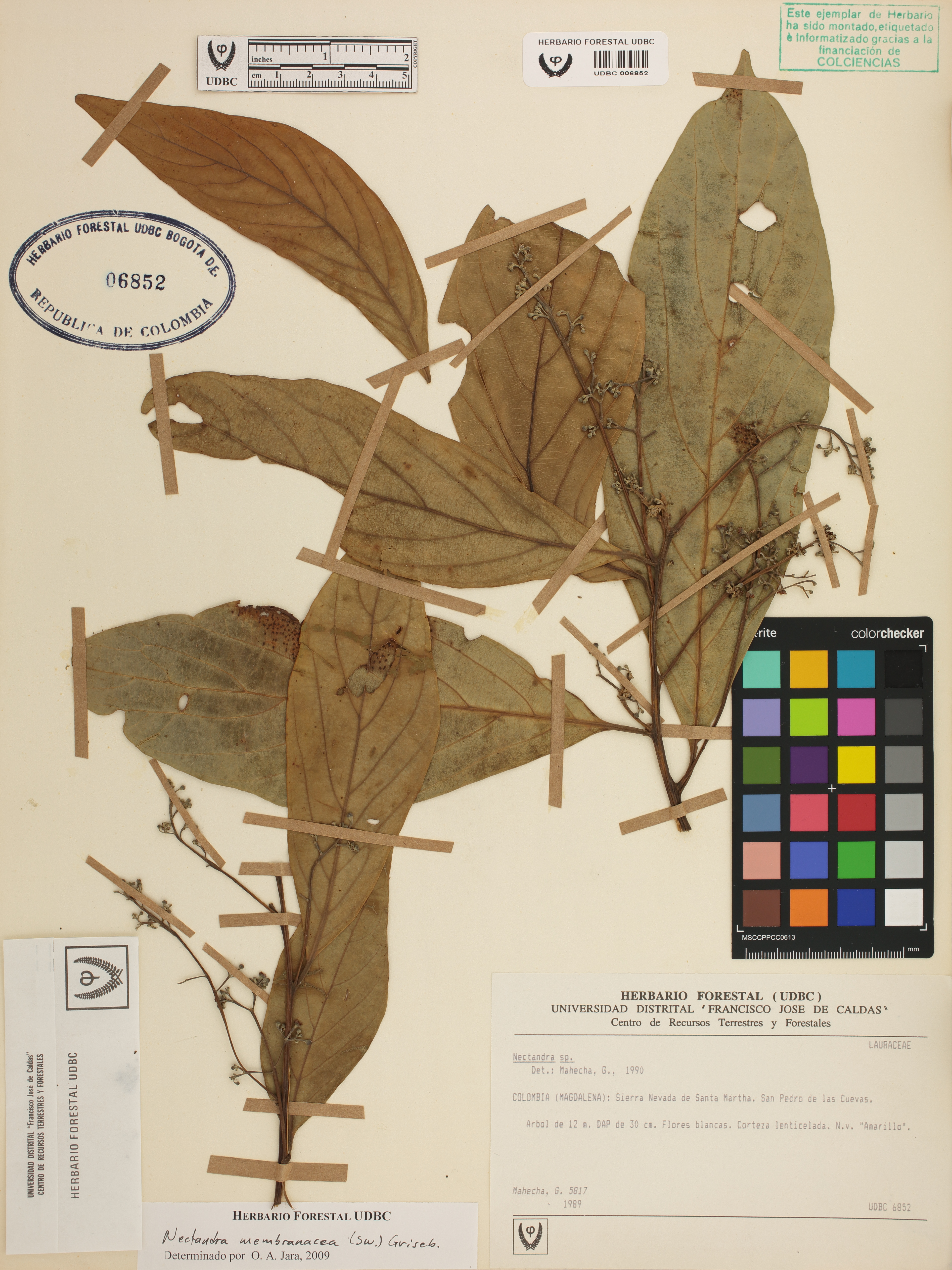 Fotografía del ejemplar Mahecha, G. 5817, determinado como Nectandra membranacea en el año 2009