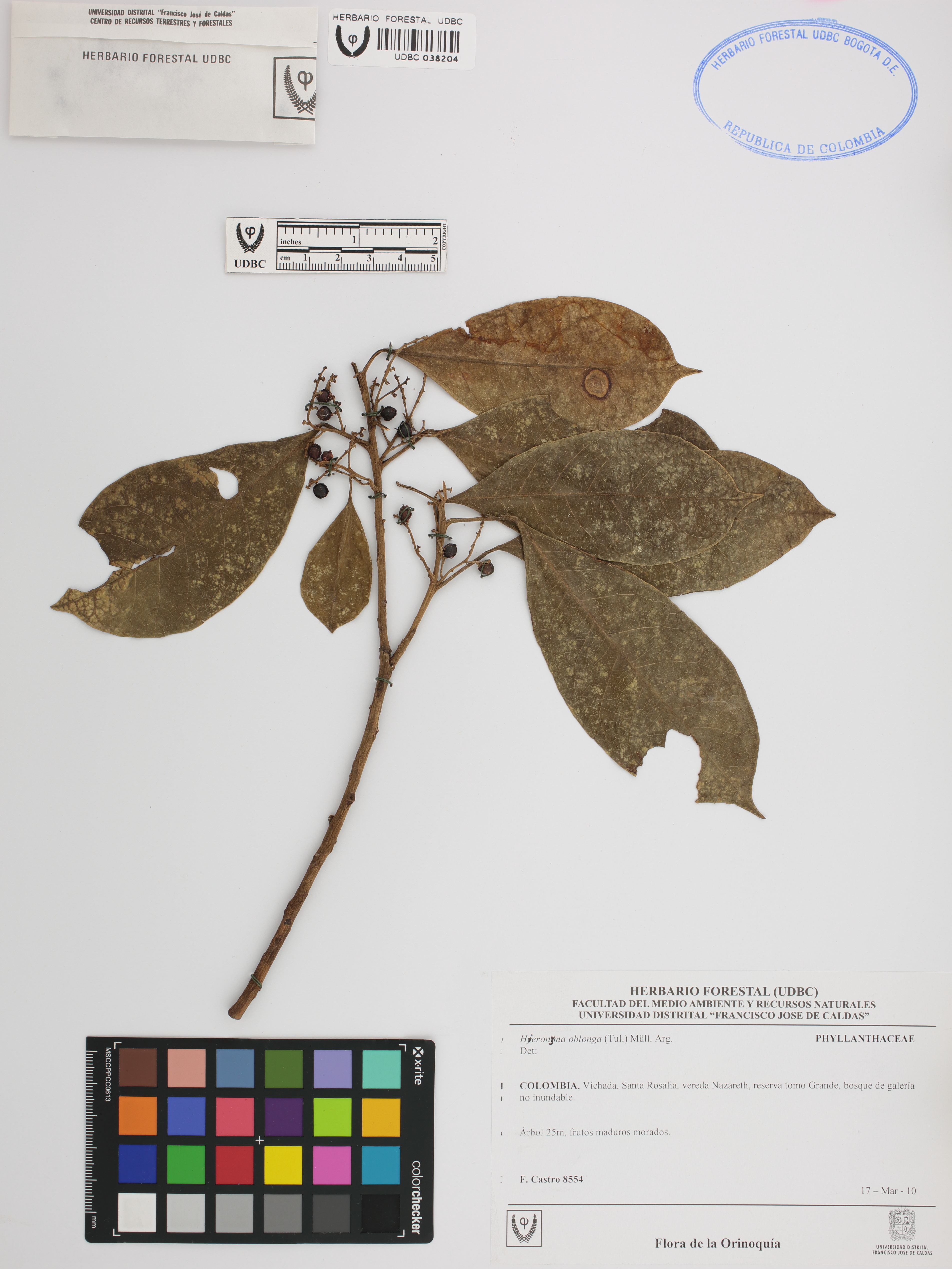 Fotografía del ejemplar Castro, F. 8554, determinado como Hieronyma oblonga