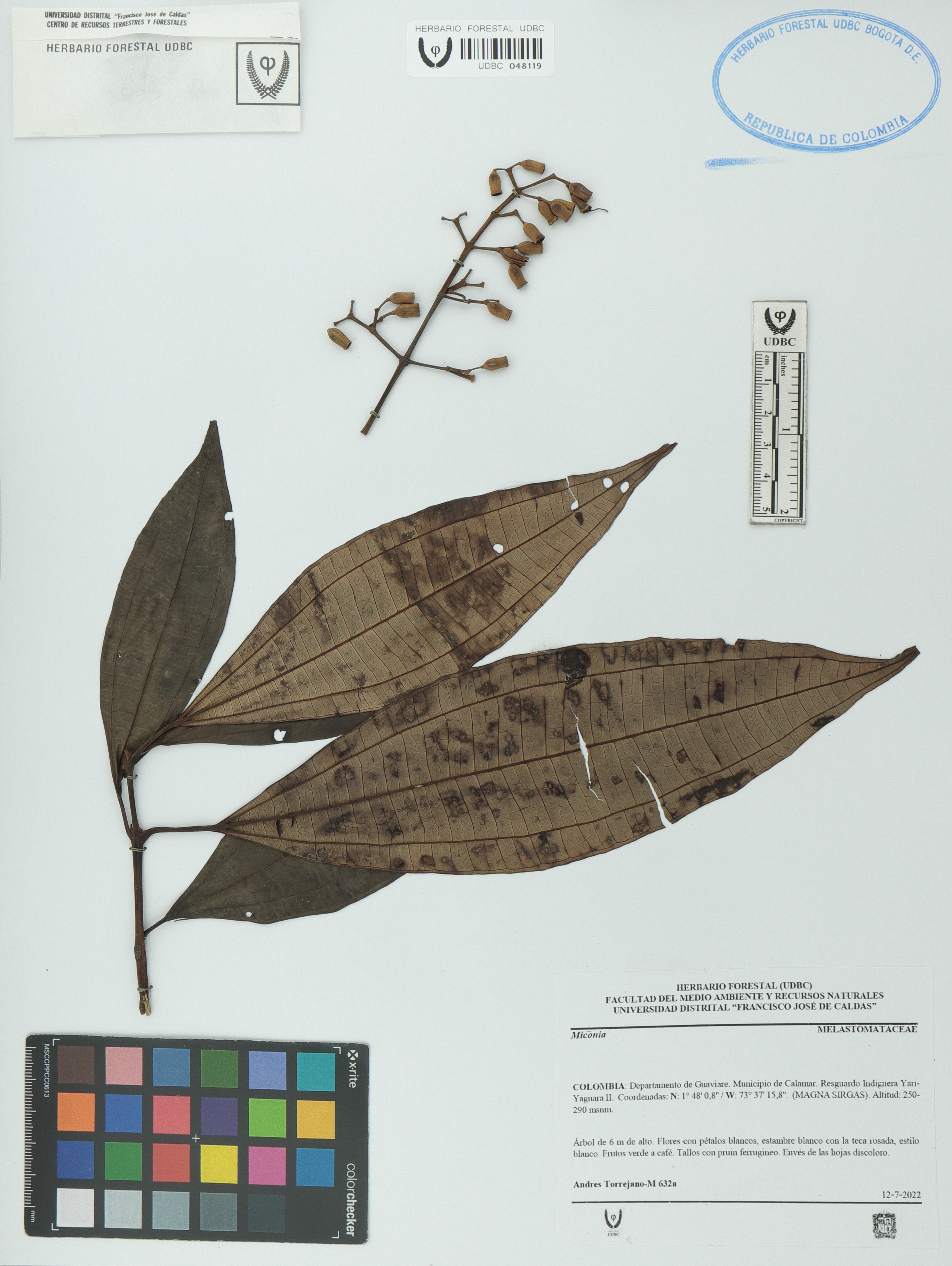 Fotografía del ejemplar Torrejano-M., Andrés 632a, determinado como Miconia sp. en el año 2022