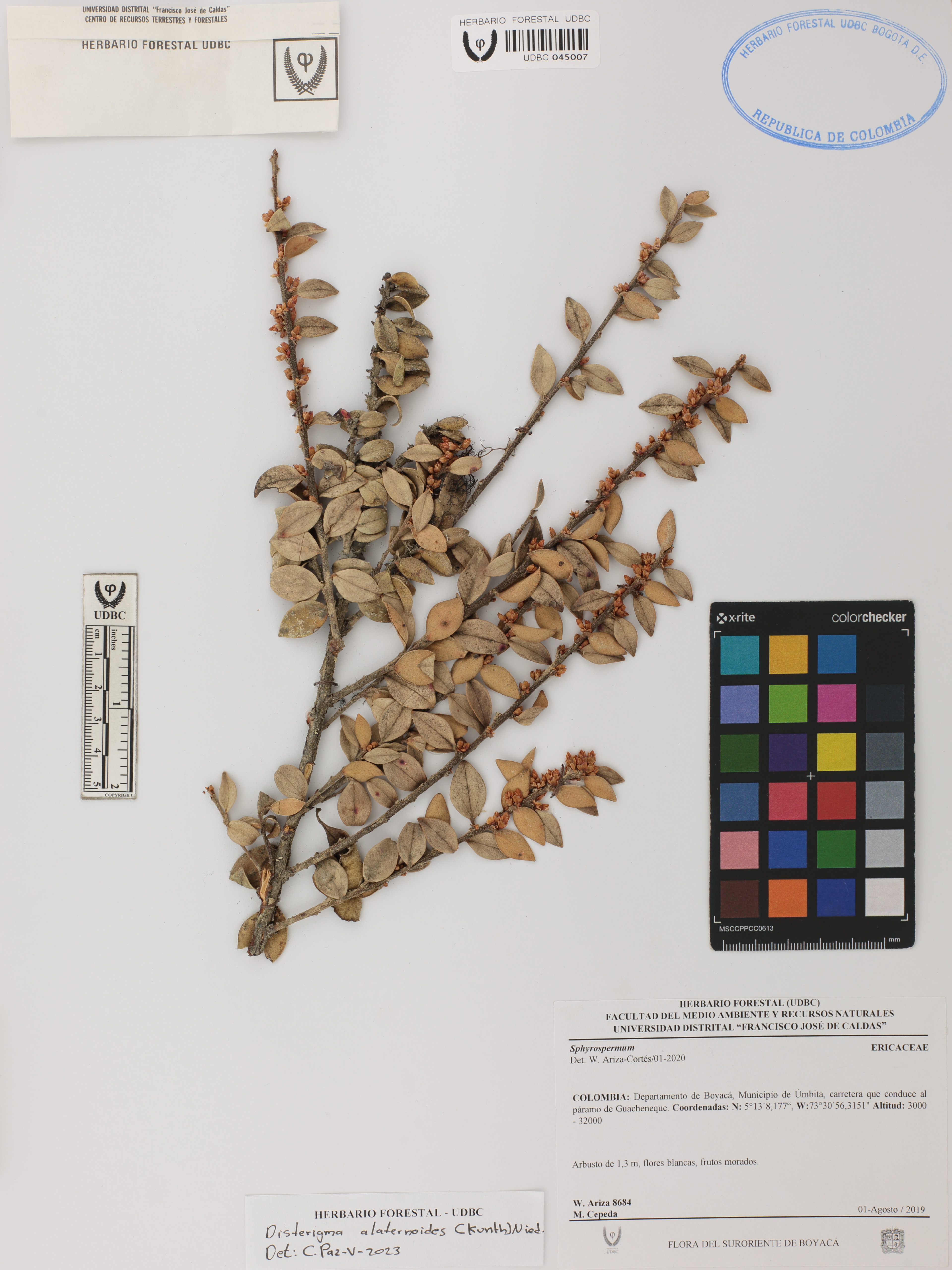 Fotografía del ejemplar Ariza, W. 8684, determinado como Disterigma alaternoides en el año 2023