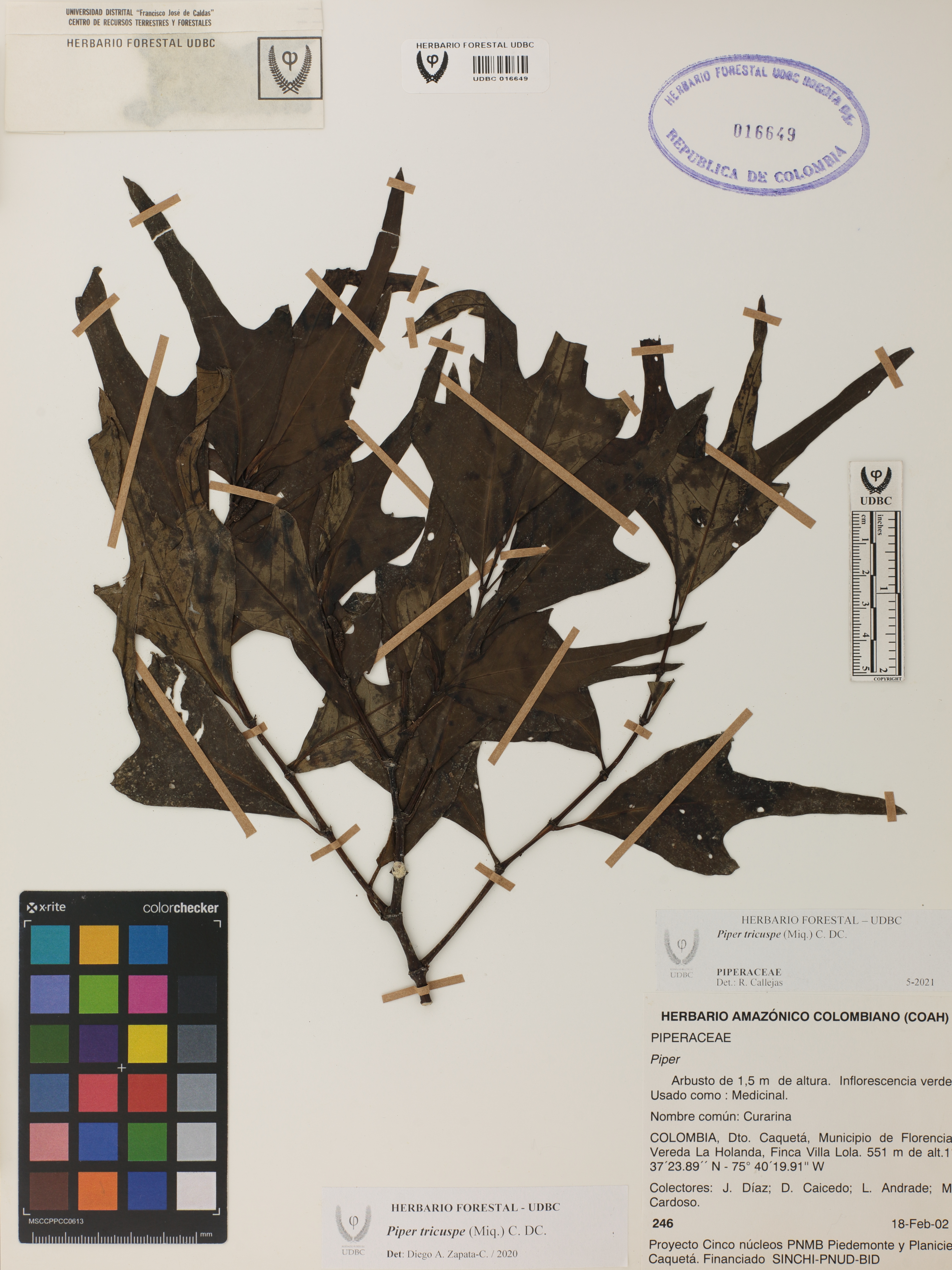 Fotografía del ejemplar Díaz, J. 246, determinado como Piper tricuspe en el año 2021