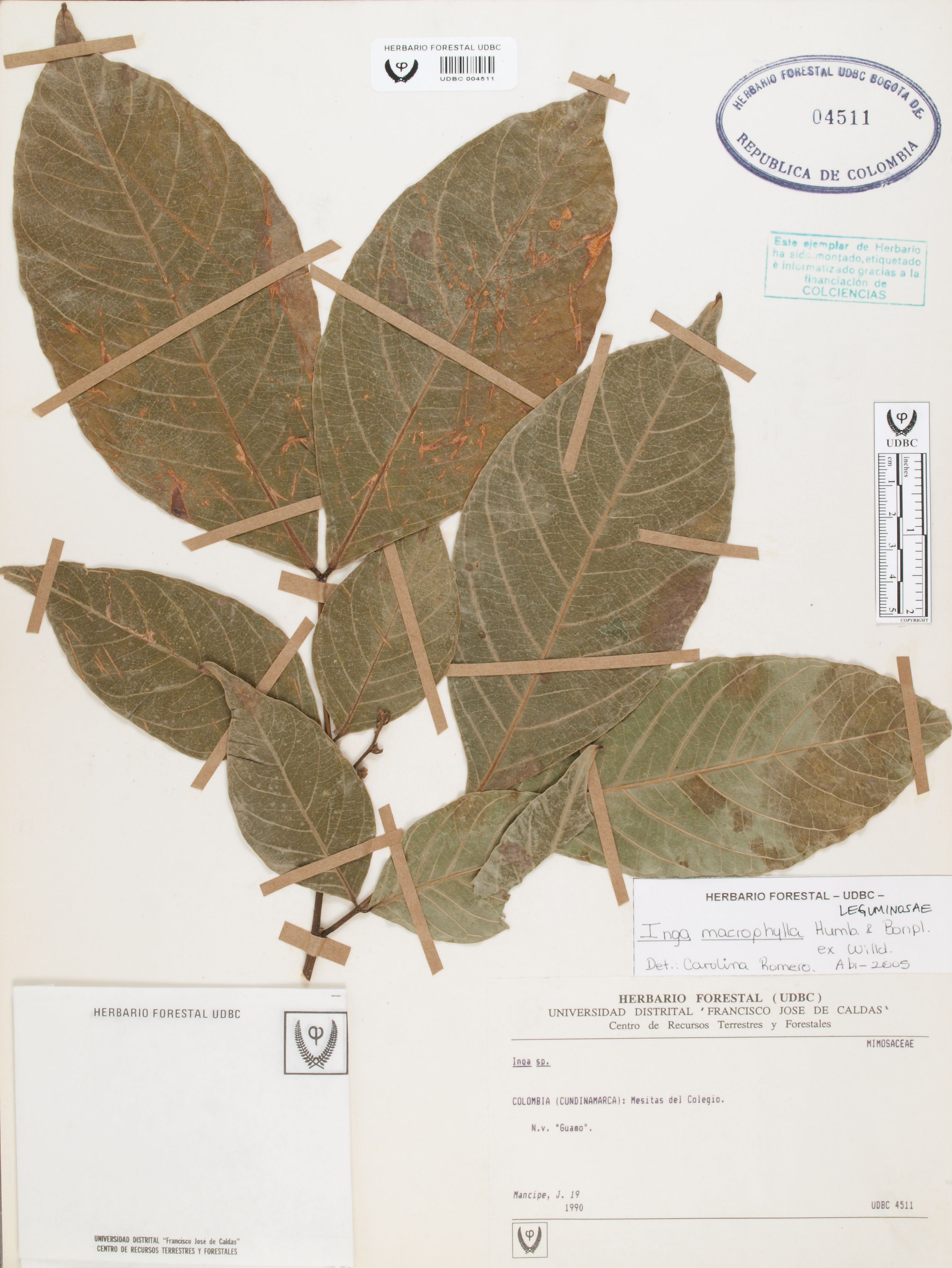 Fotografía del ejemplar Mancipe, J. 19, determinado como Inga macrophylla en el año 2005