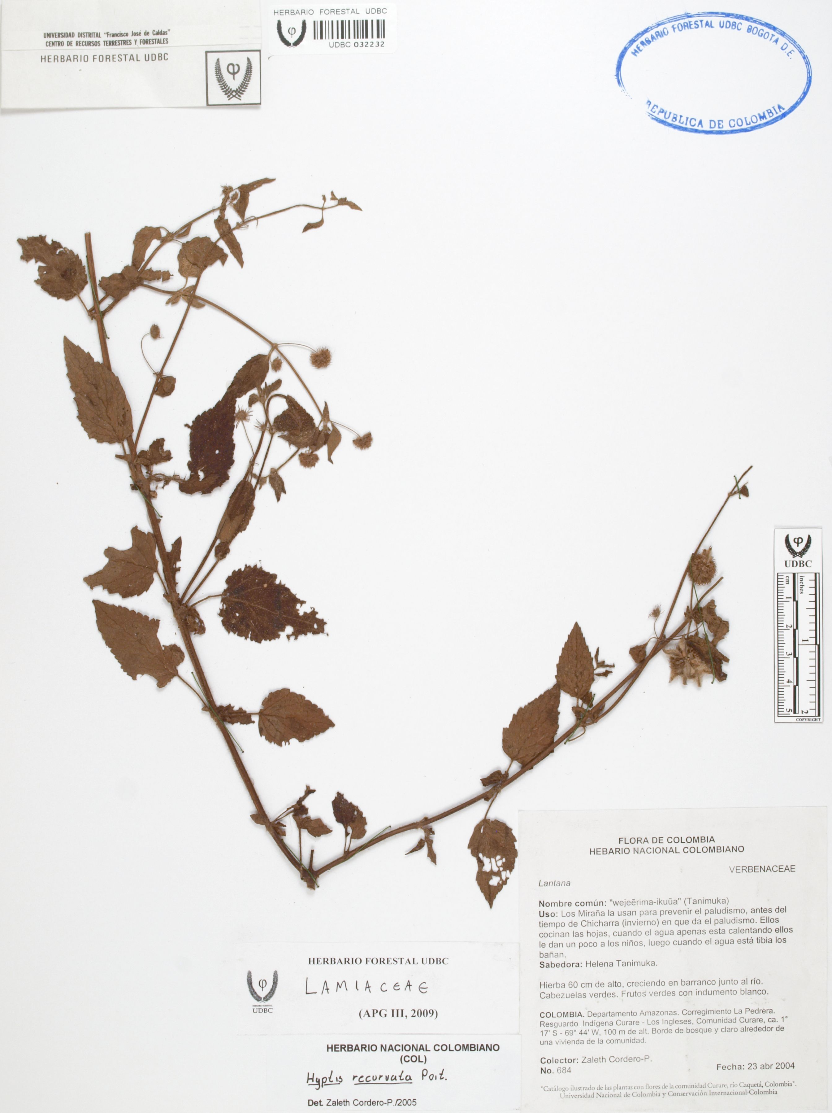 Fotografía del ejemplar Cordero-P., Z. 684, determinado como Hyptis recurvata en el año 2005