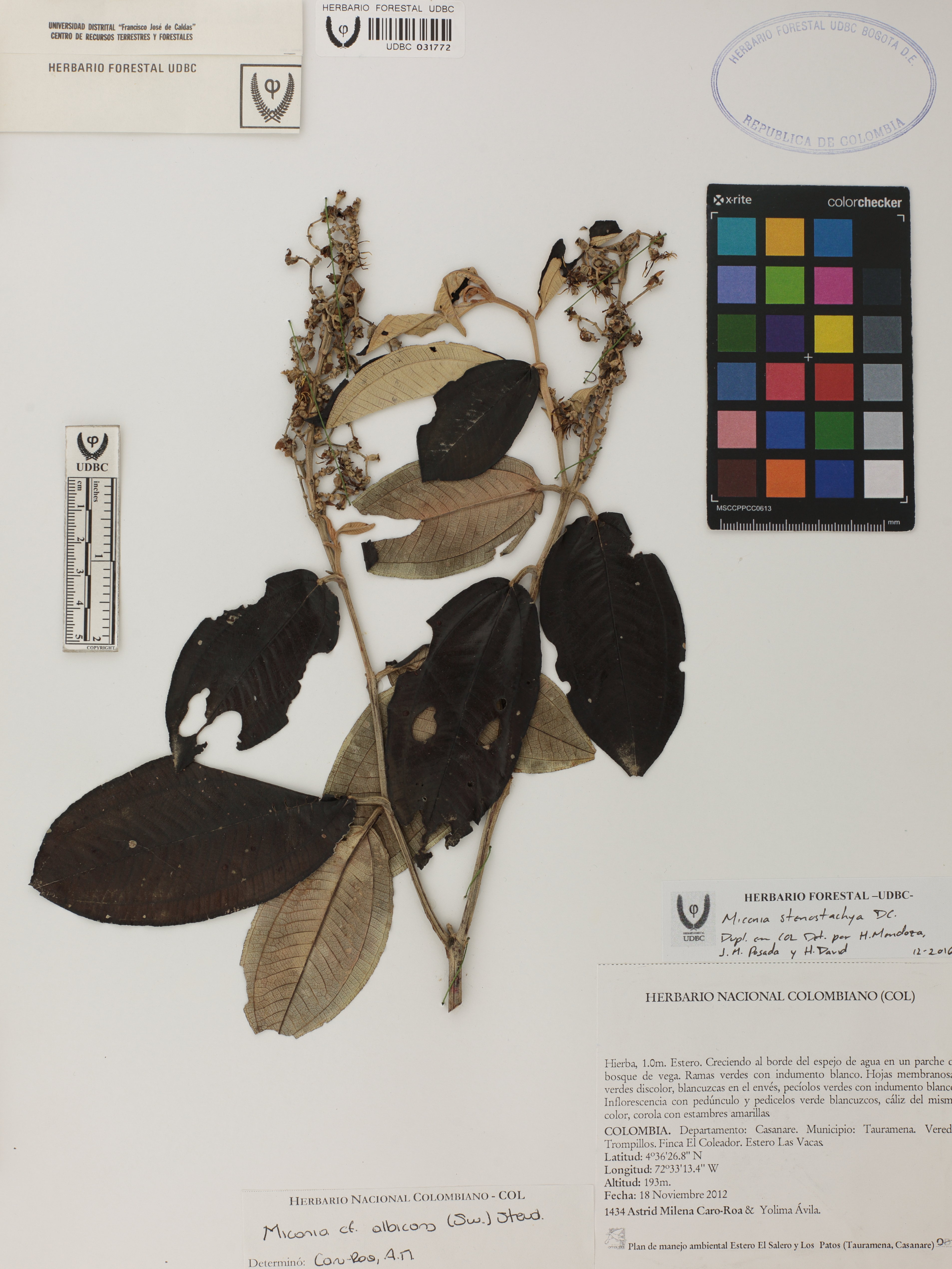 Fotografía del ejemplar Caro-Roa, A. 1434, determinado como Miconia stenostachya en el año 2016
