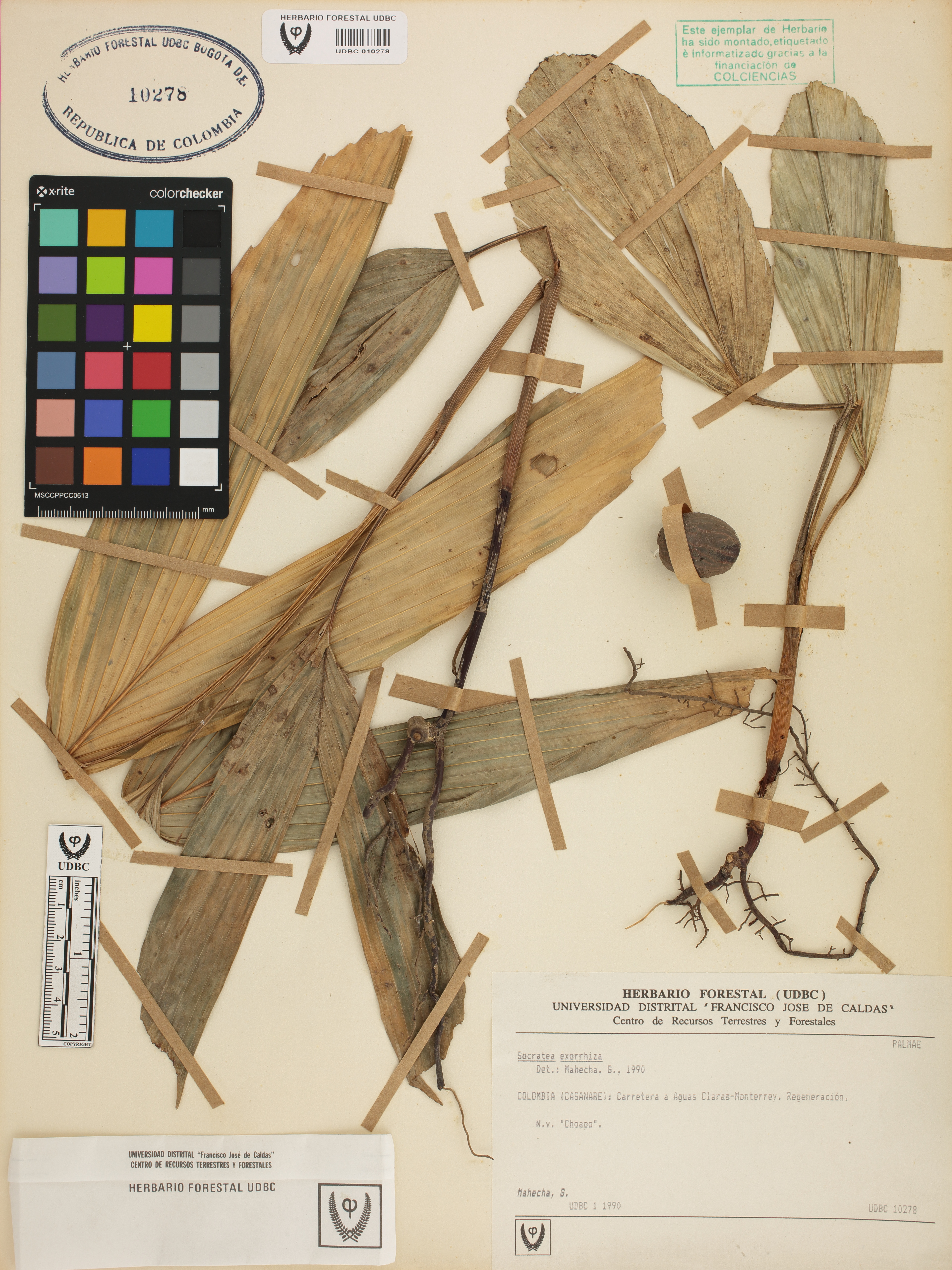 Fotografía del ejemplar Mahecha, G., determinado como Socratea exorrhiza en el año 1990