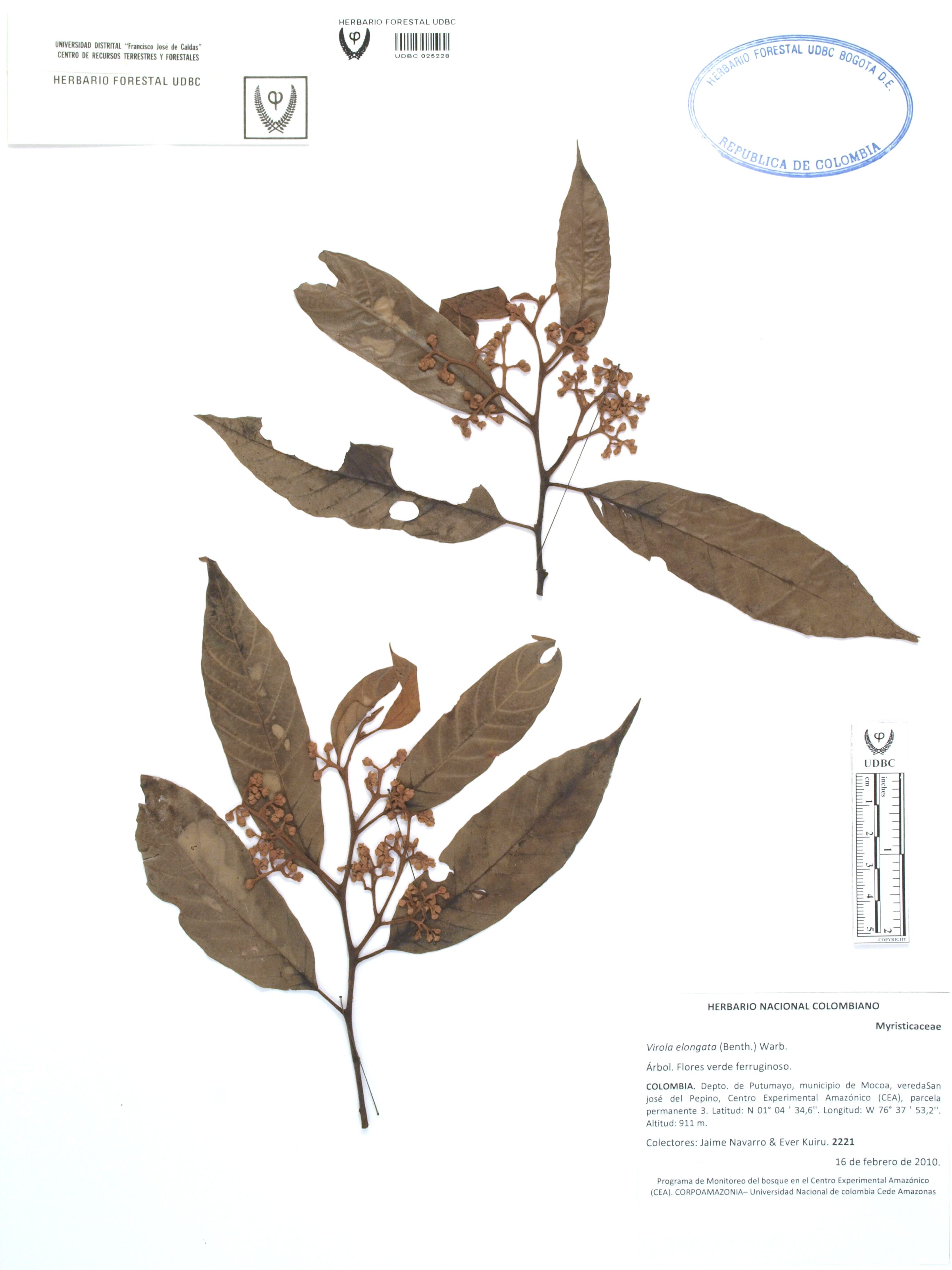 Fotografía del ejemplar Navarro, J. 2221, determinado como Virola elongata