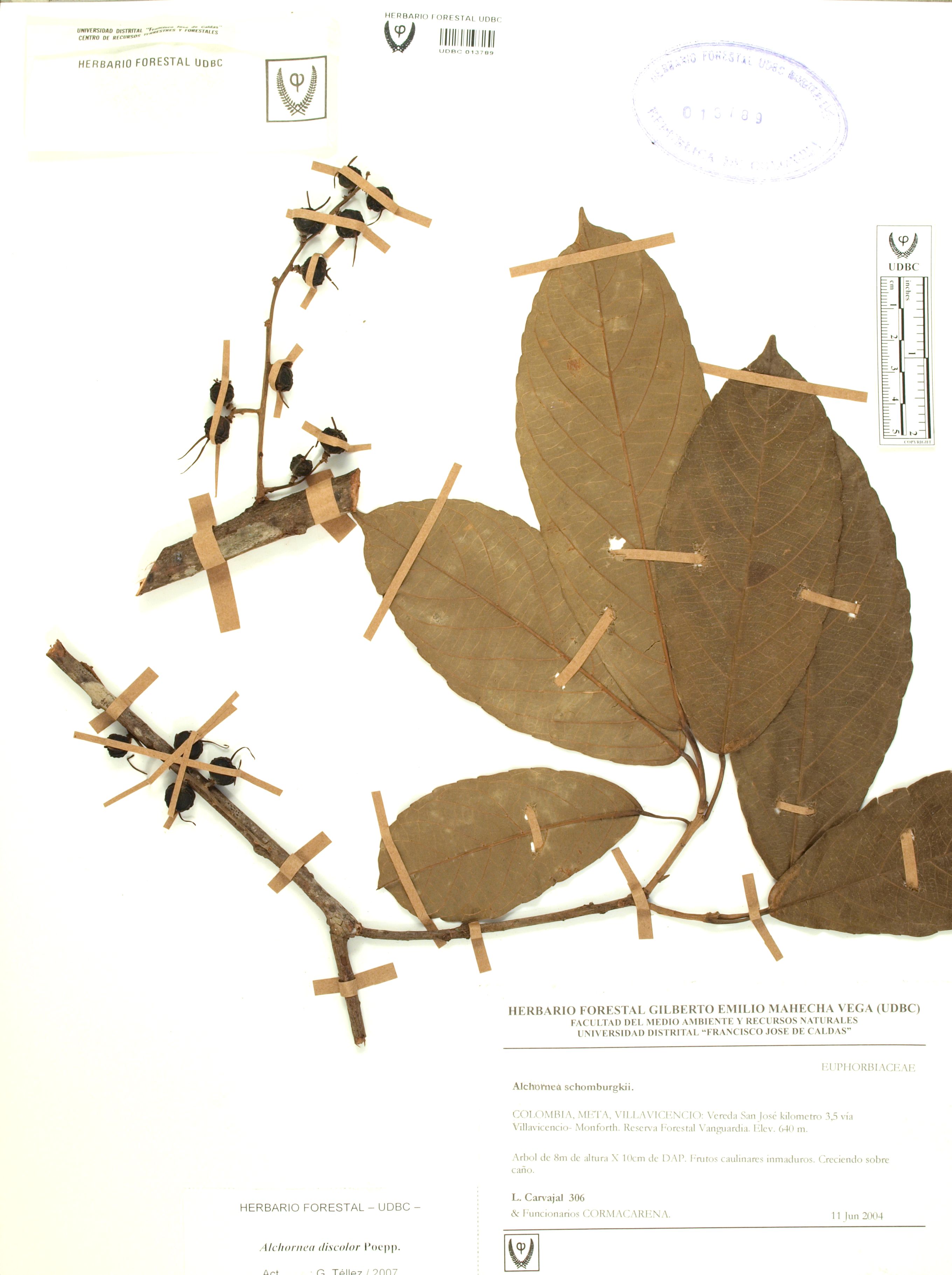 | dc.description | Fotografía del ejemplar Carvajal, L. 306, determinado como Alchornea discolor en el año 2007 | |