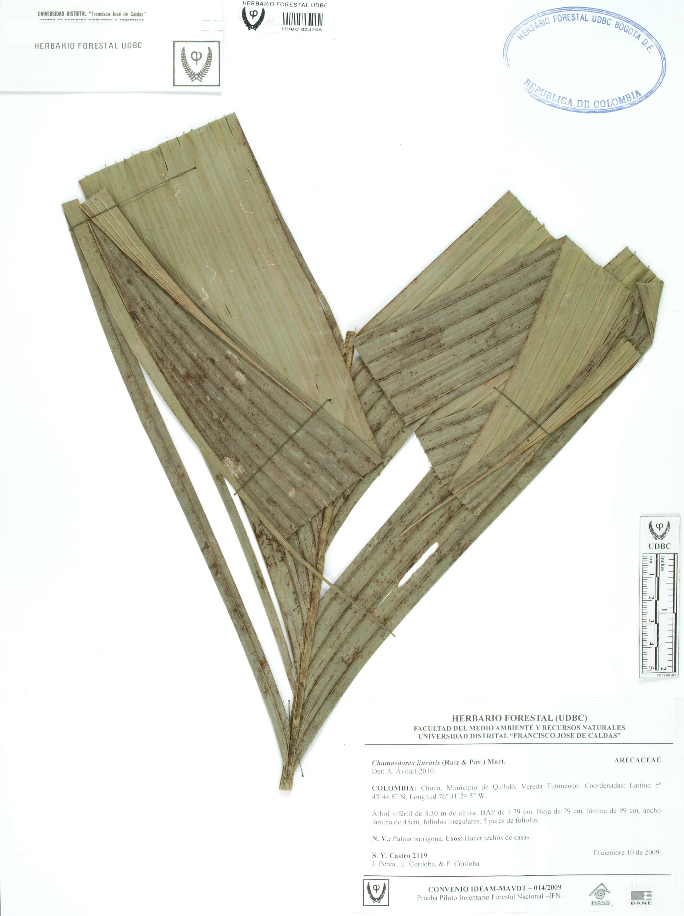 Fotografía del ejemplar Castro, S. 2119, determinado como Chamaedorea linearis en el año 2010
