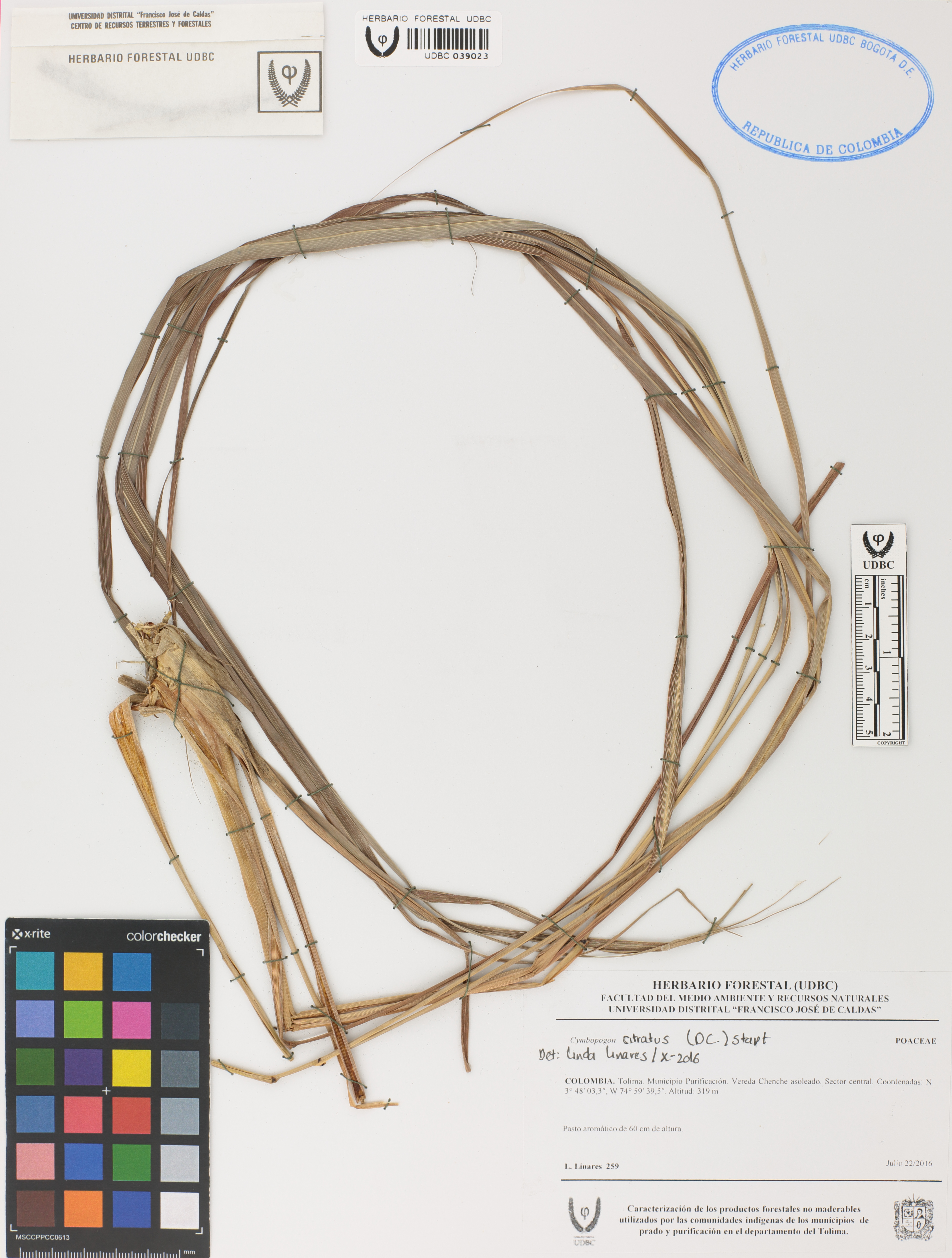Fotografía del ejemplar Linares, L. 259, determinado como Cymbopogon citratus en el año 2016