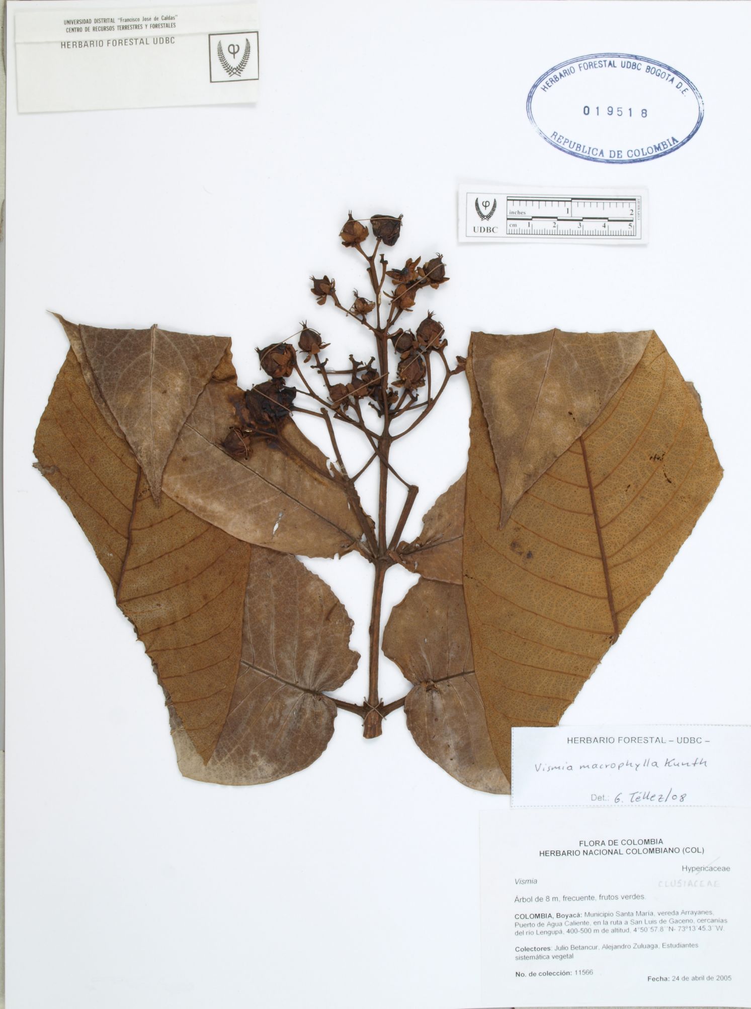 Fotografía del ejemplar Betancur, J. 11566, determinado como Vismia macrophylla en el año 2008