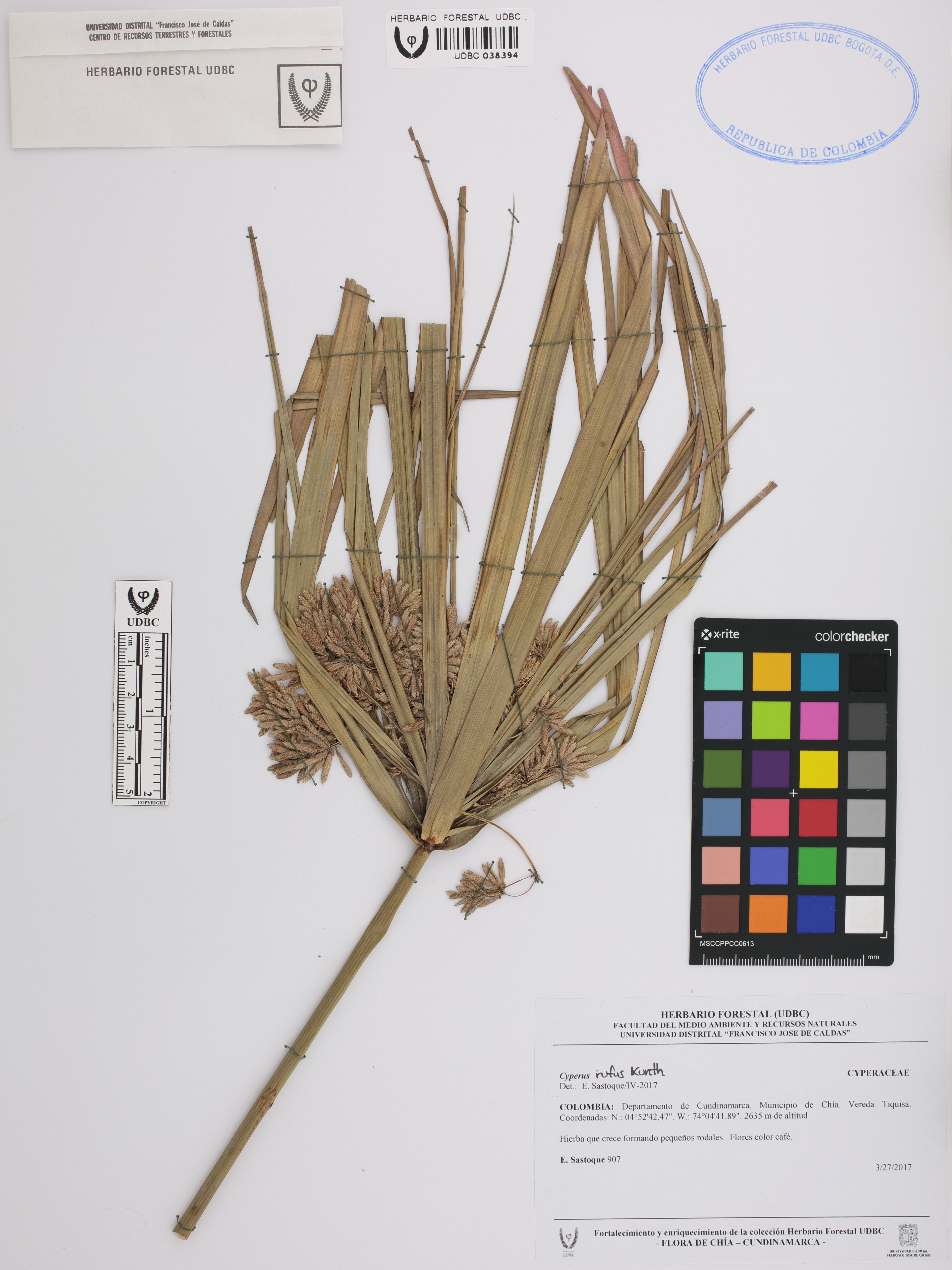 Fotografía del ejemplar Sastoque, E. 907, determinado como Cyperus xanthostachyus en el año 2017