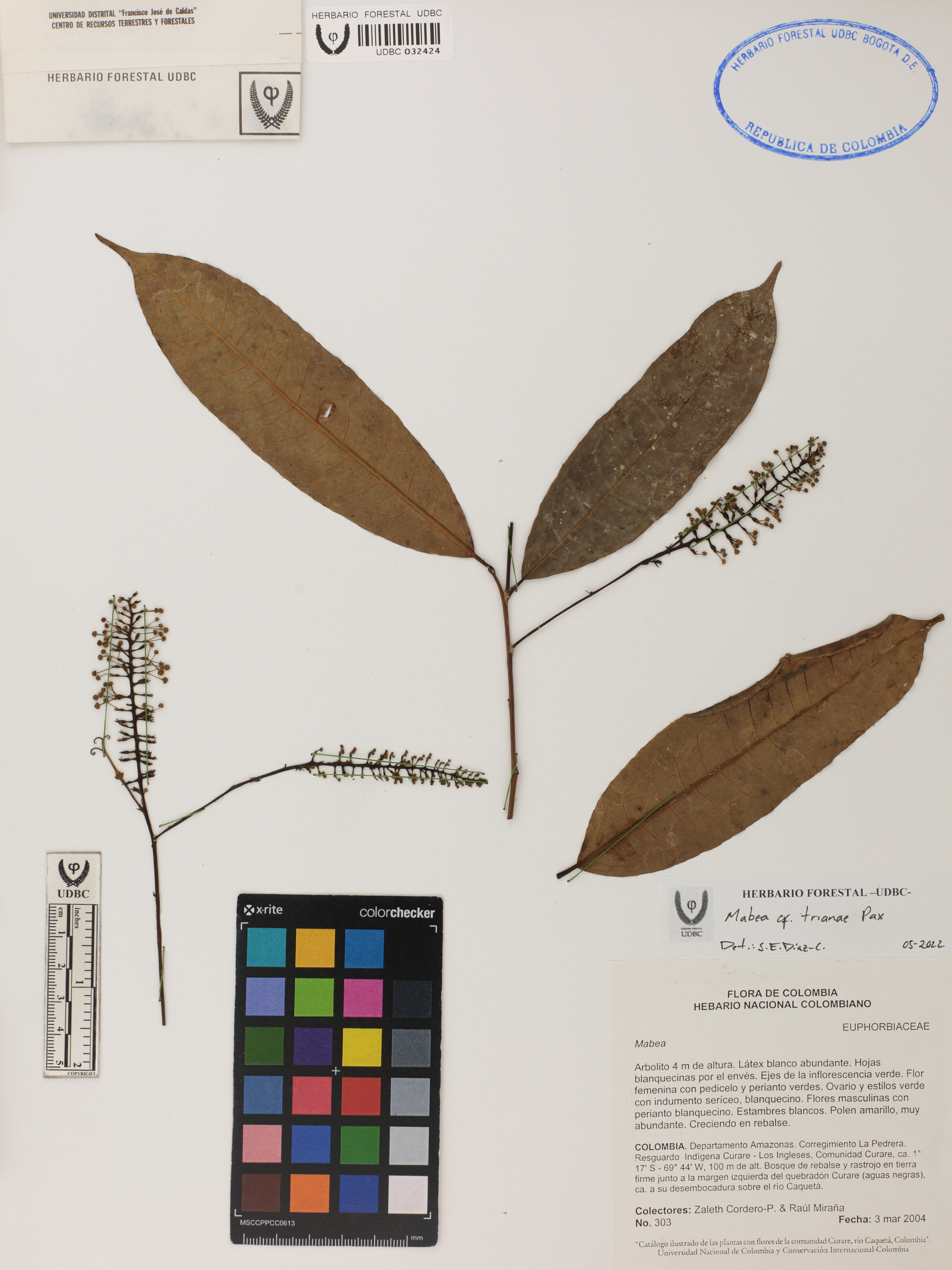 Fotografía del ejemplar Cordero-P., Z. 303, determinado como Mabea trianae en el año 2022