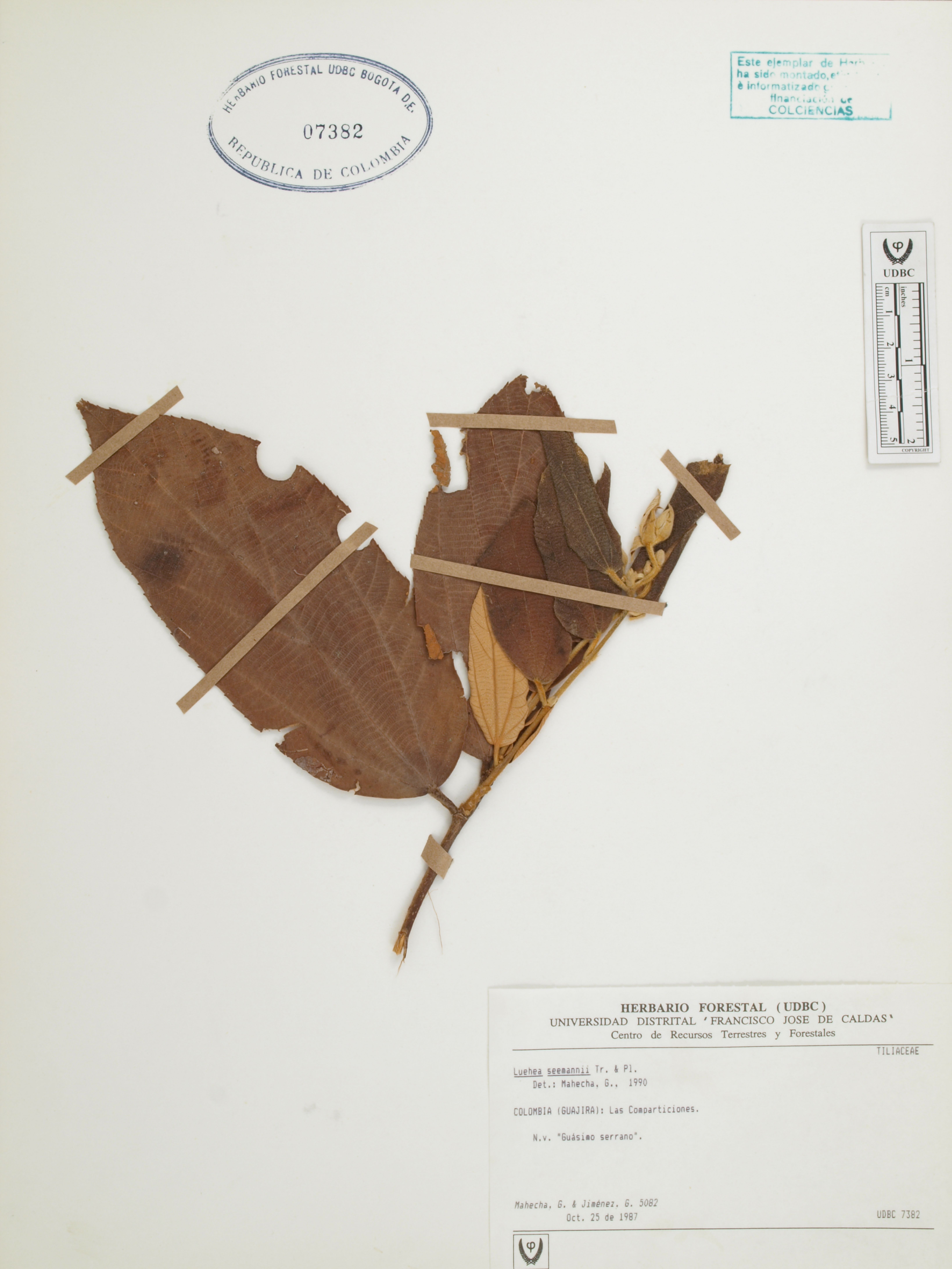 Fotografía del ejemplar Mahecha, G. 5082, determinado como Luehea seemannii en el año 1990