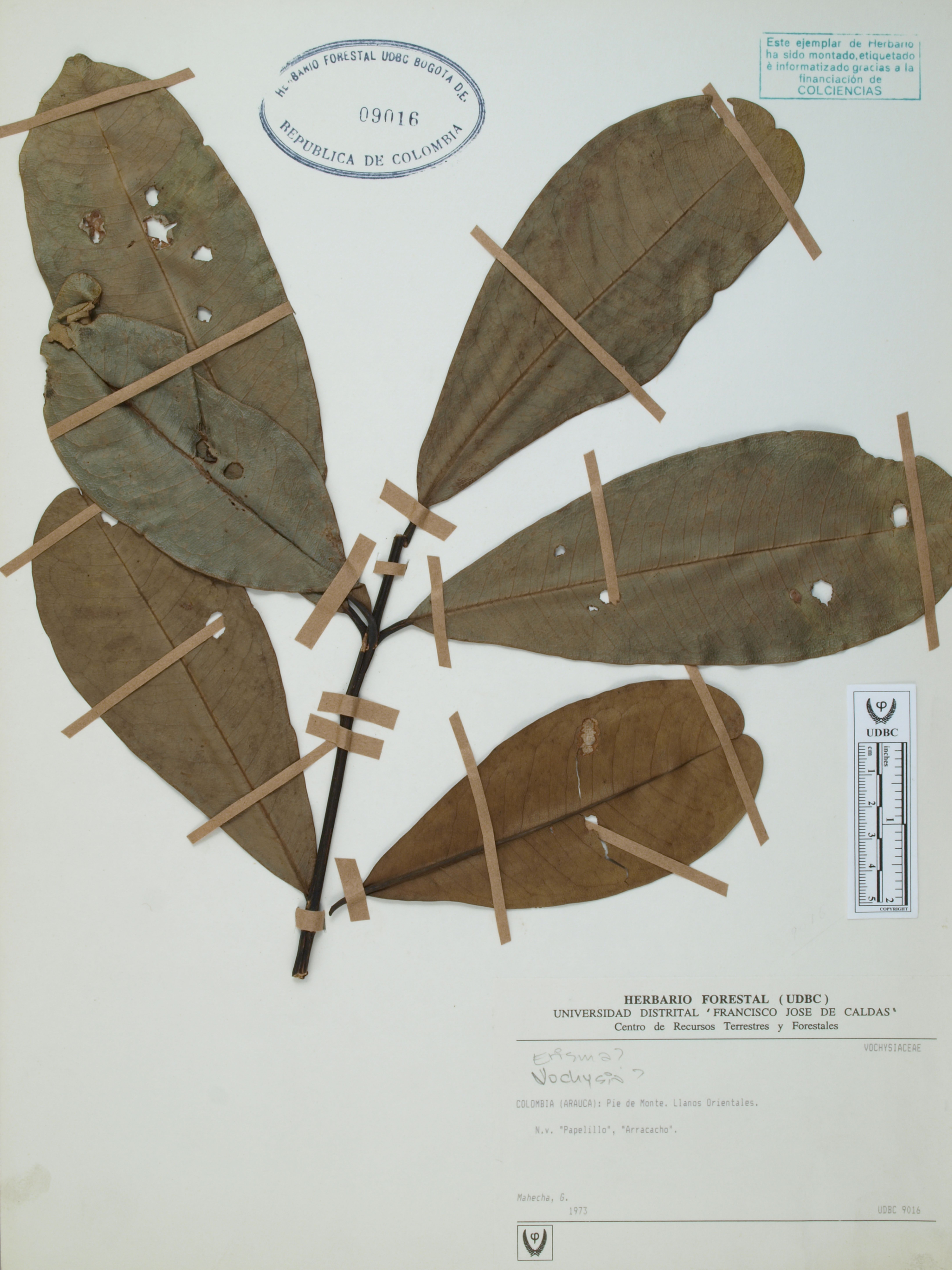 Fotografía del ejemplar Mahecha, G., determinado como Erisma sp. en el año 1996