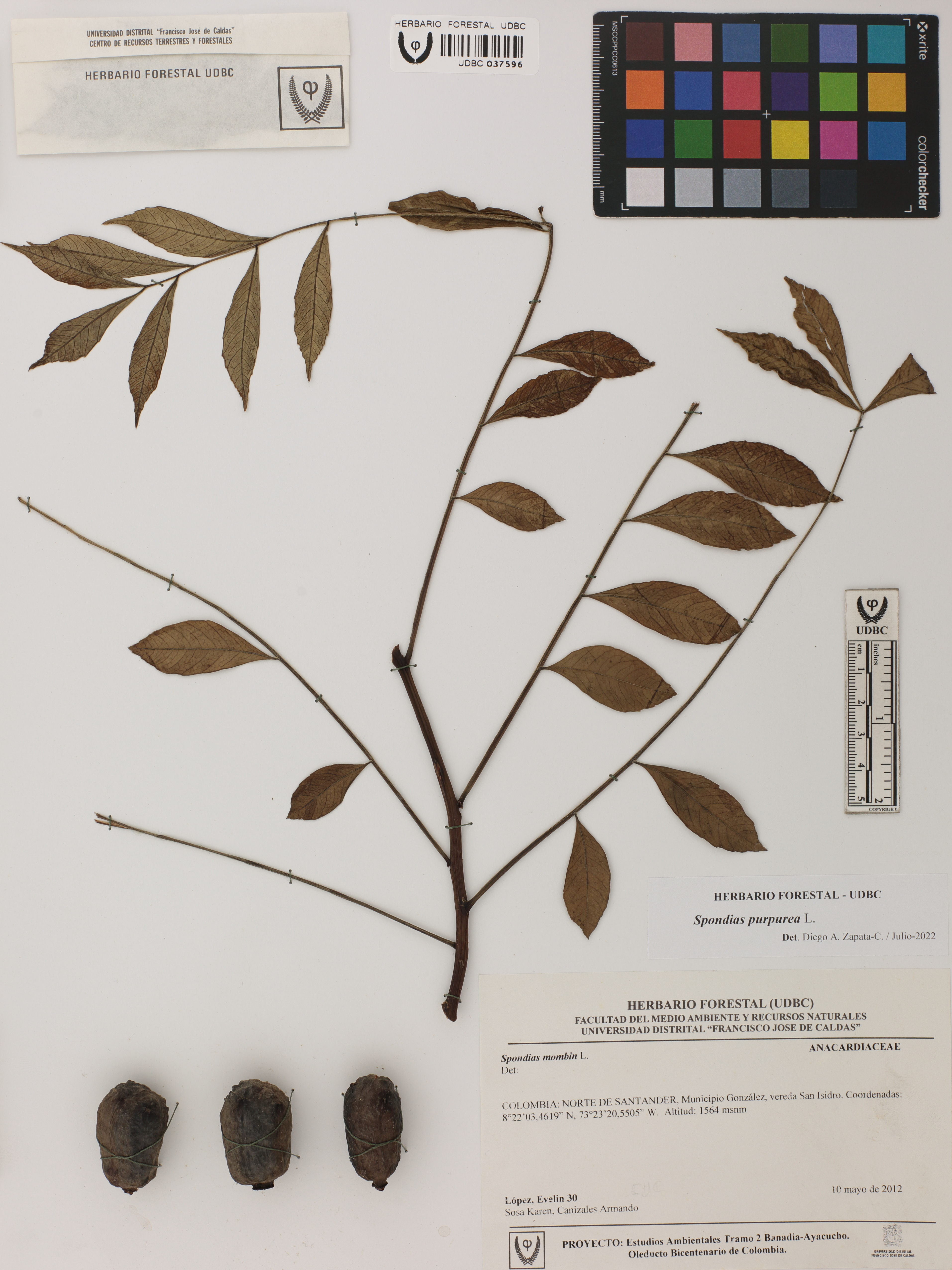 Fotografía del ejemplar López, E. 30, determinado como Spondias purpurea en el año 2022