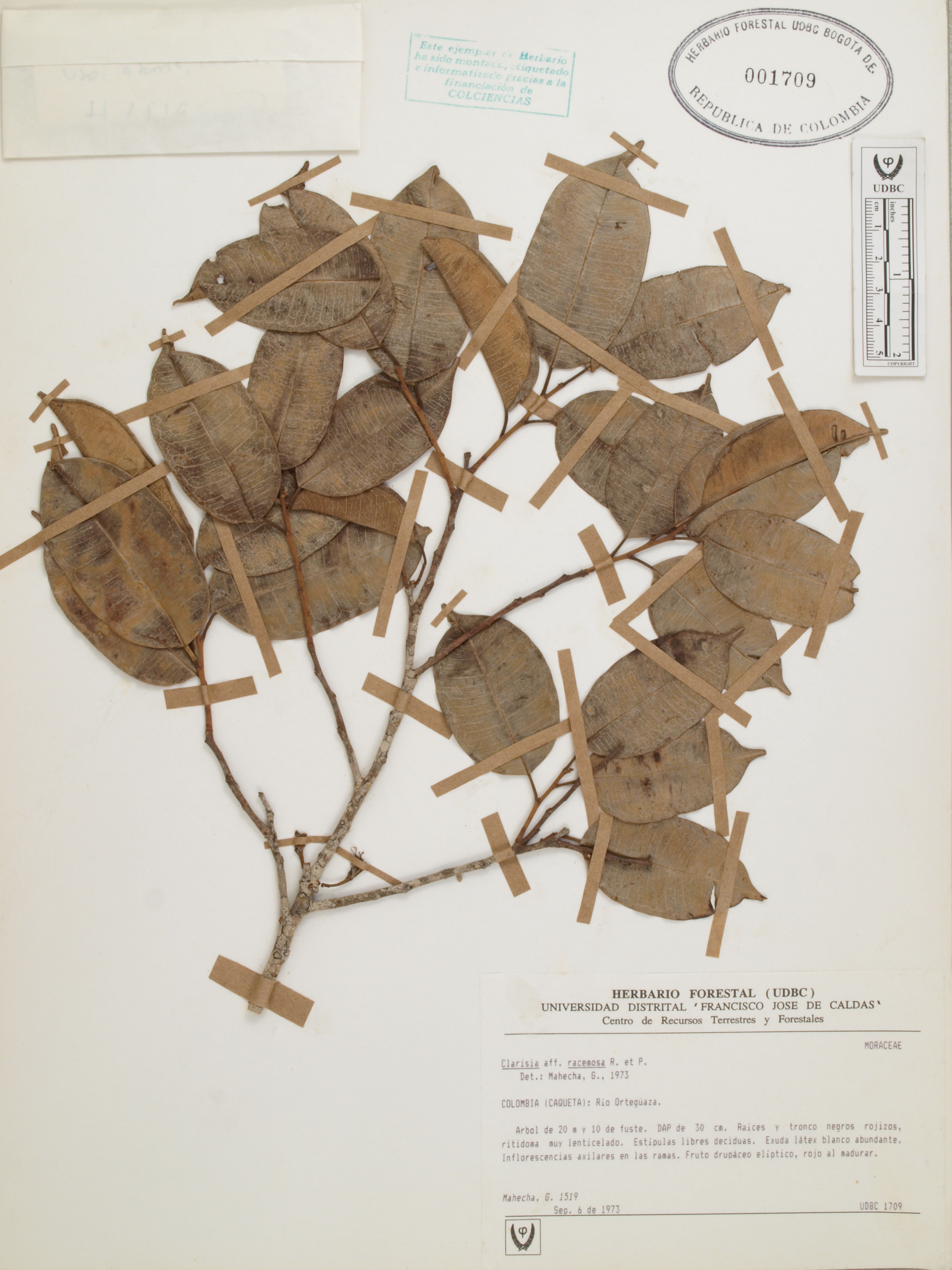 Fotografía del ejemplar Mahecha, G. 1519, determinado como Clarisia racemosa en el año 1973