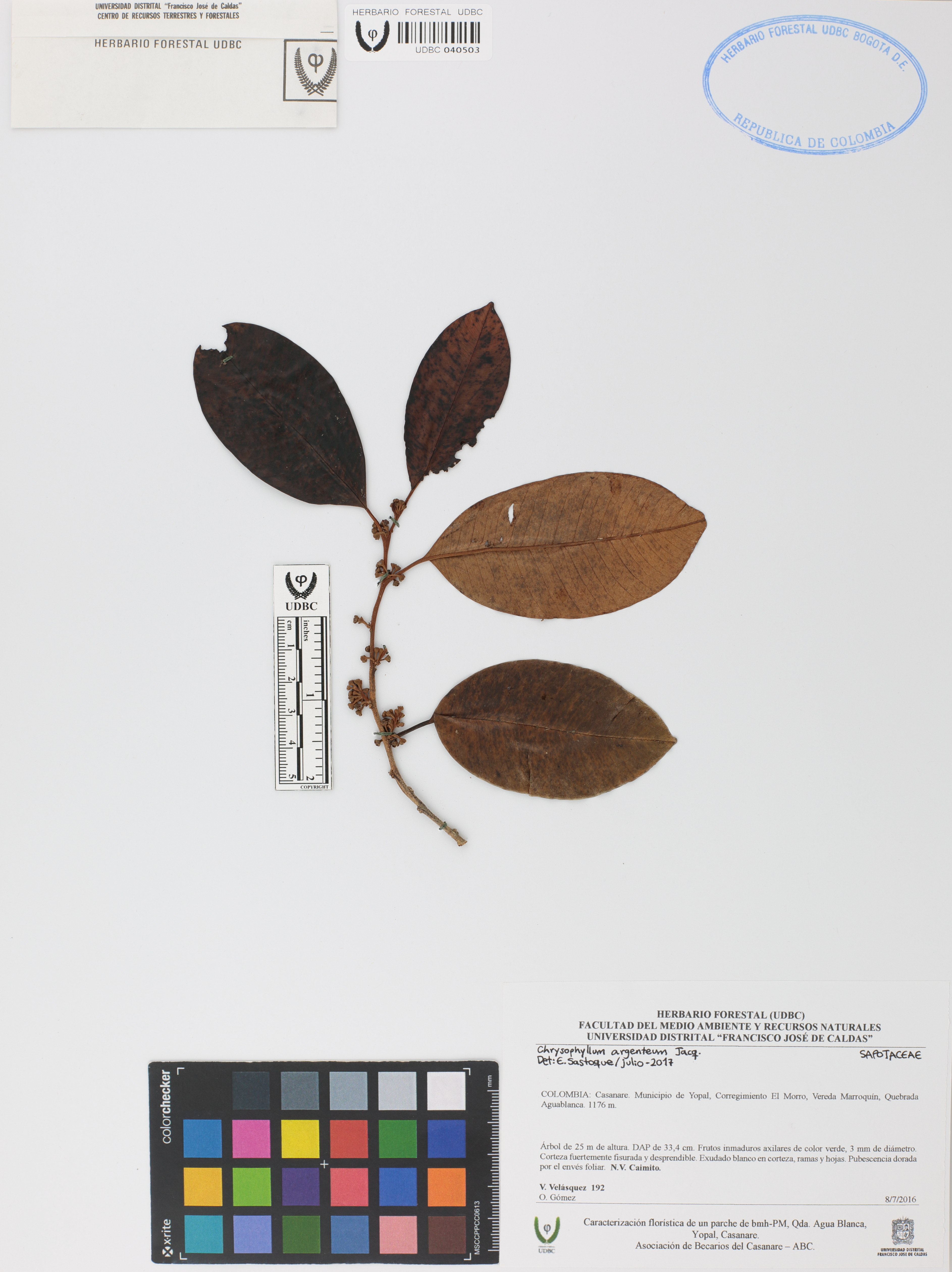 Fotografía del ejemplar Velásquez, V. 192, determinado como Chrysophyllum argenteum en el año 2017
