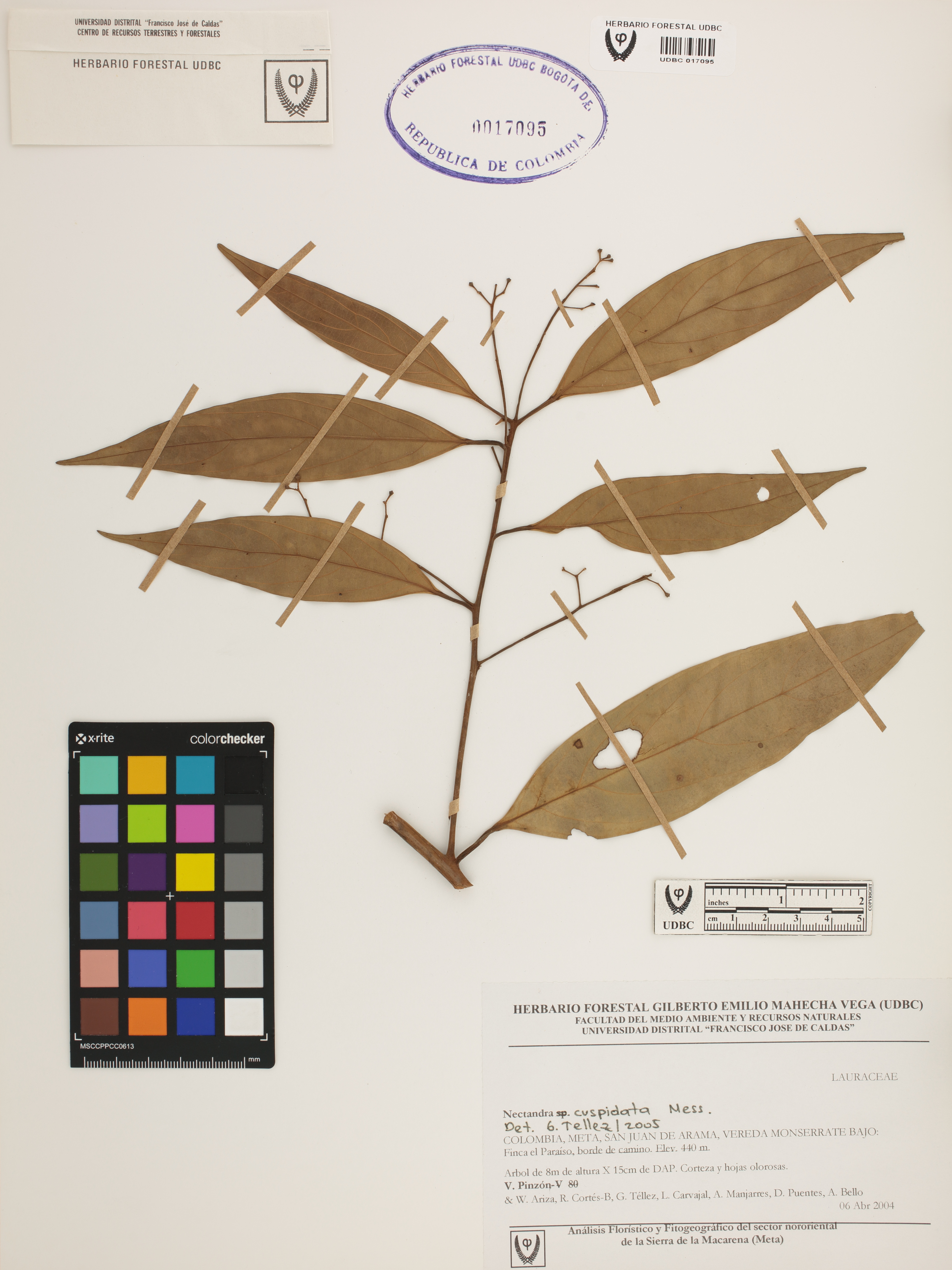 Fotografía del ejemplar Pinzón-V., V. 80, determinado como Nectandra cuspidata en el año 2005