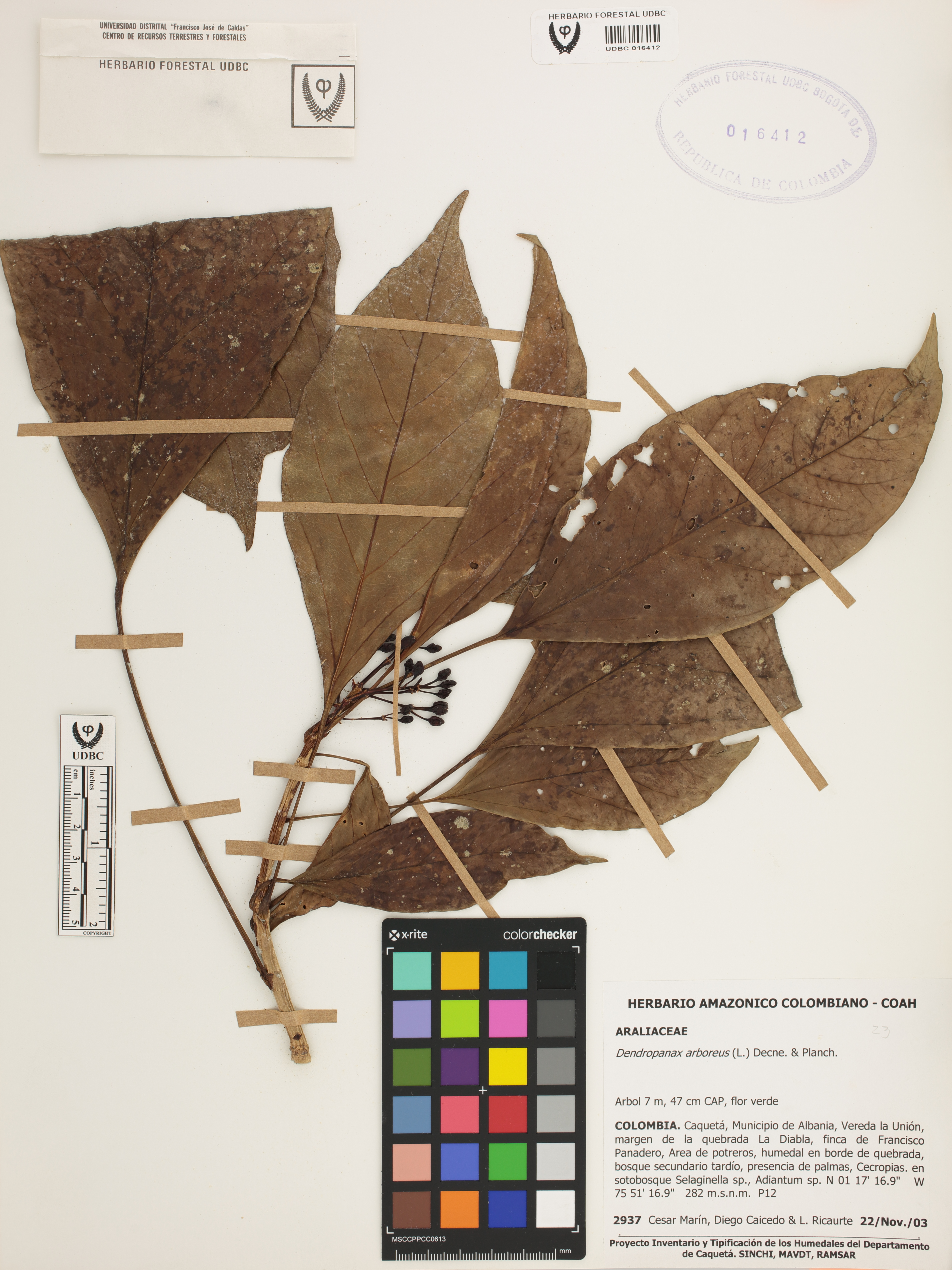 Fotografía del ejemplar Marín, C. 2937, determinado como Dendropanax arboreus