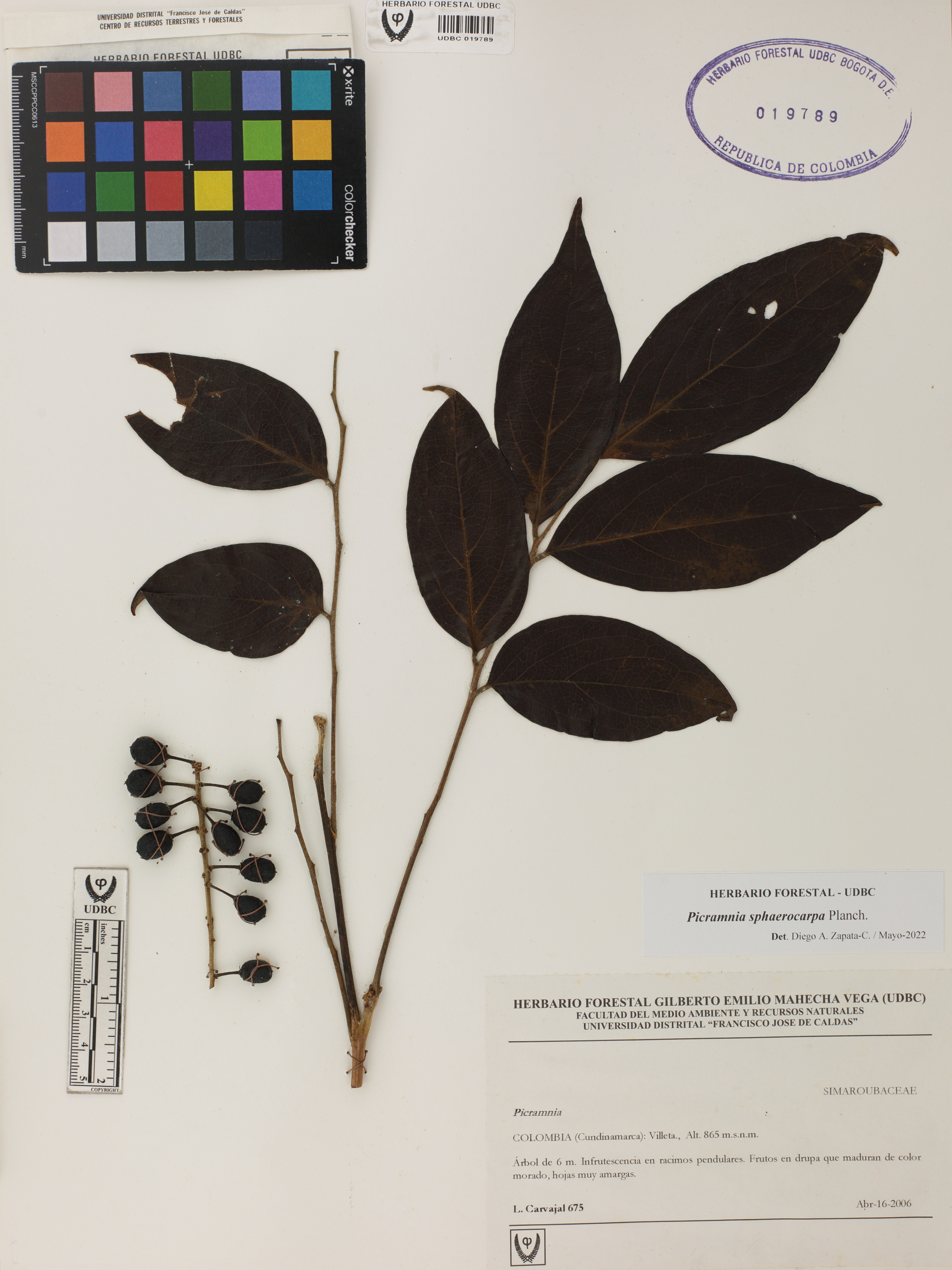 Fotografía del ejemplar Carvajal, L. 675, determinado como Picramnia sphaerocarpa en el año 2022