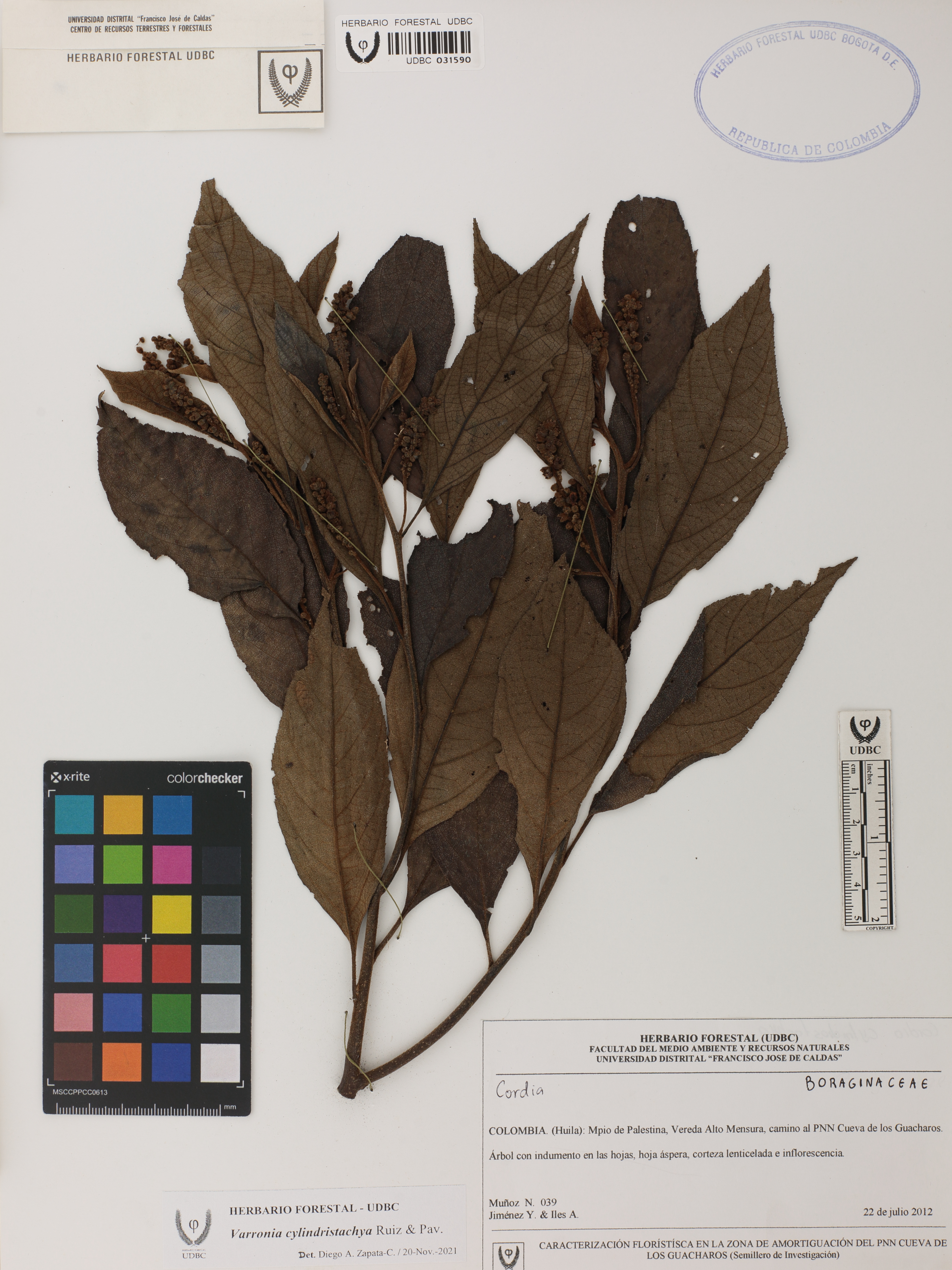 Fotografía del ejemplar Muñoz, N. 39, determinado como Varronia cylindristachya en el año 2021