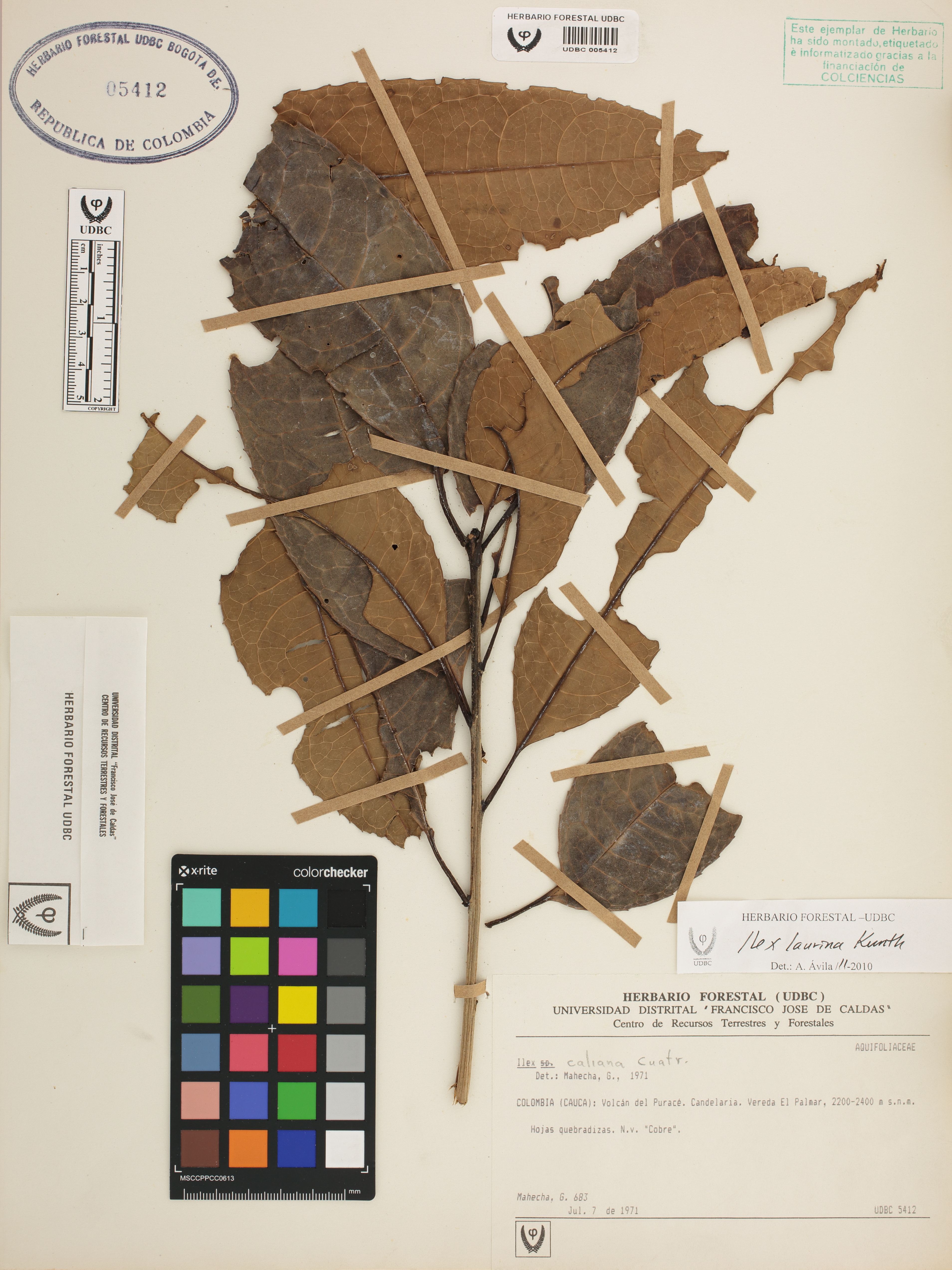 Fotografía del ejemplar Mahecha, G. 683, determinado como Ilex laurina en el año 2010