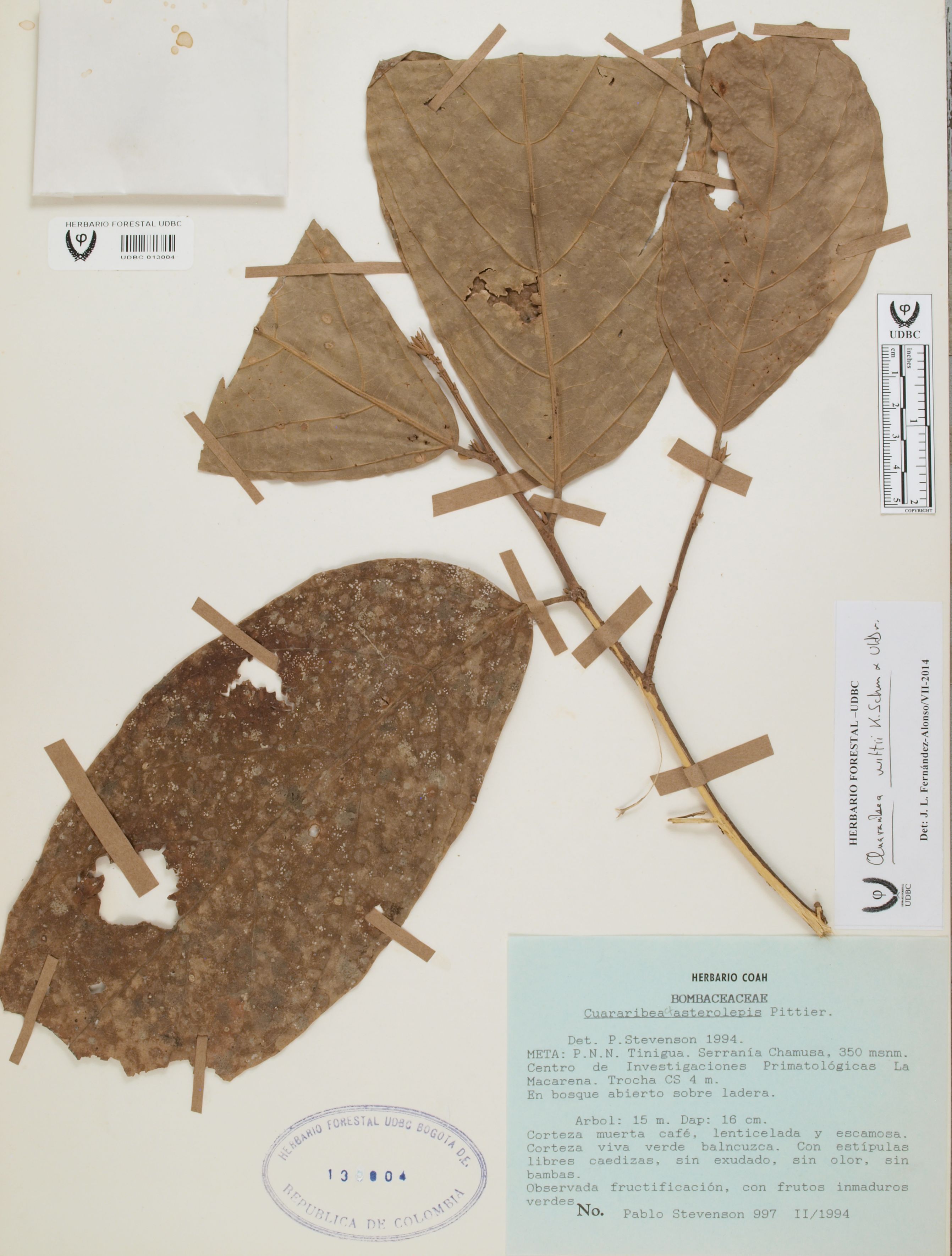 Fotografía del ejemplar Stevenson, P. 997, determinado como Quararibea wittii en el año 2014