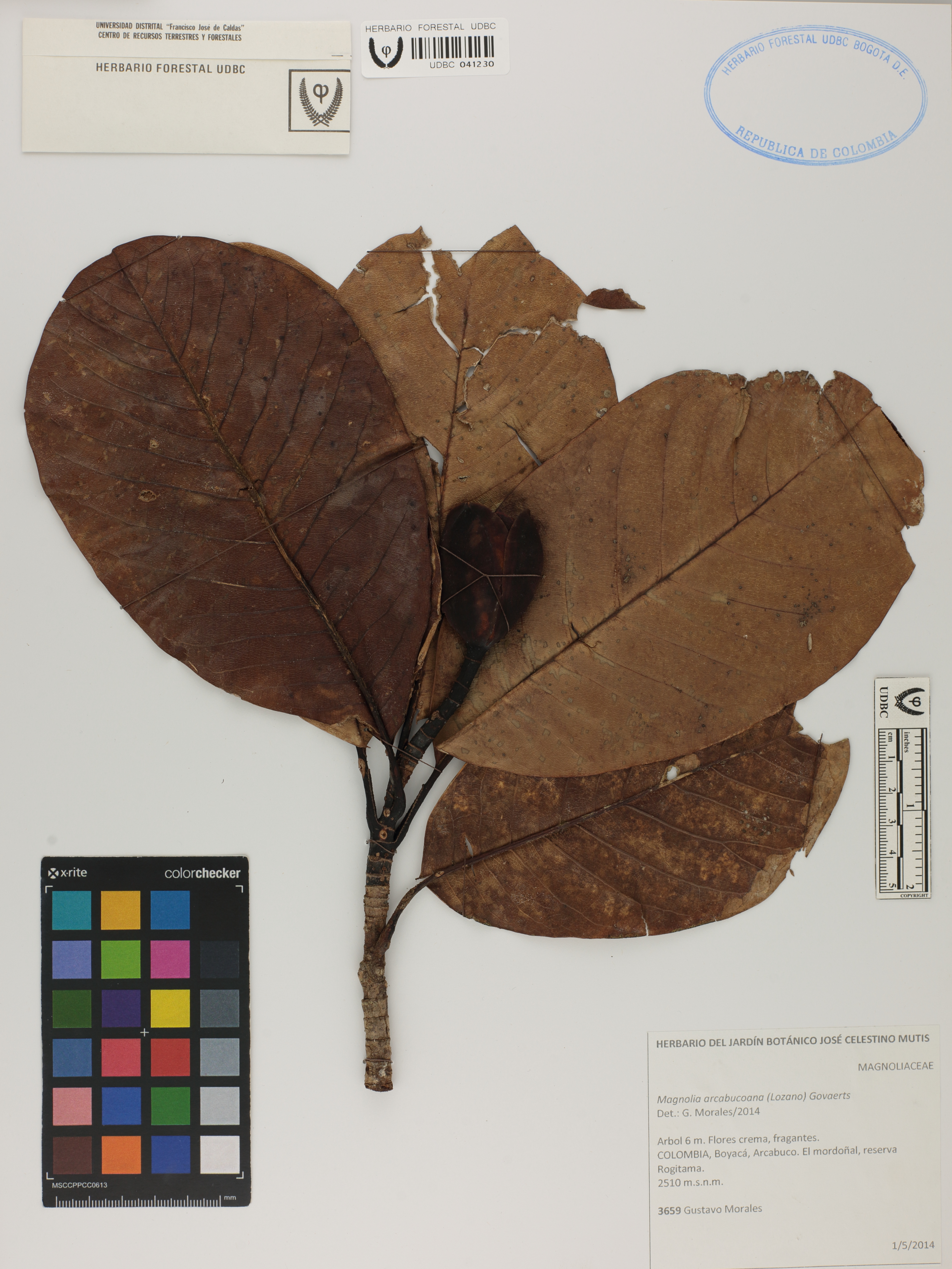 Fotografía del ejemplar Morales, G. 3659, determinado como Magnolia arcabucoana en el año 2014