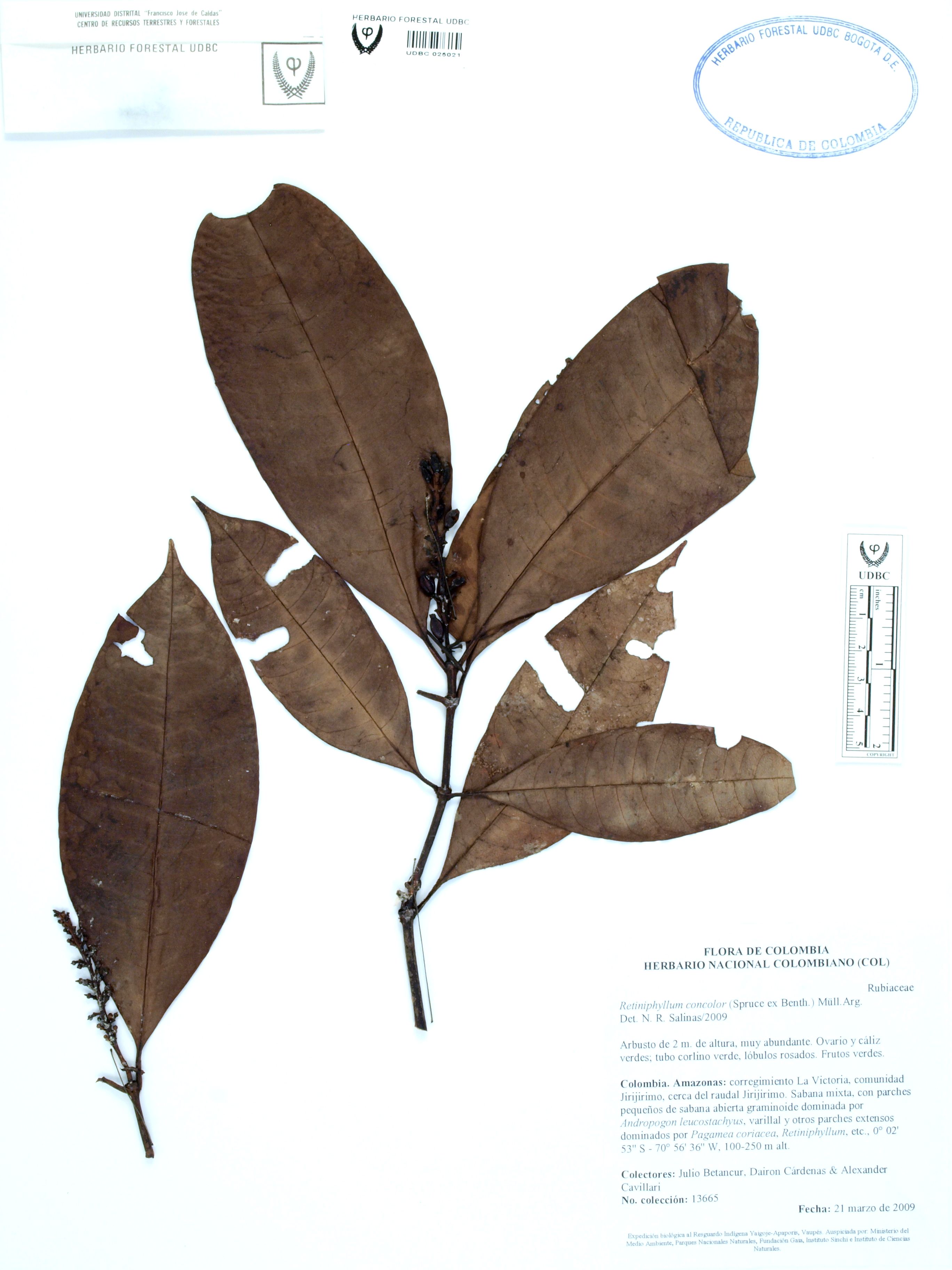 Fotografía del ejemplar Betancur, J. 13665, determinado como Retiniphyllum concolor en el año 2009