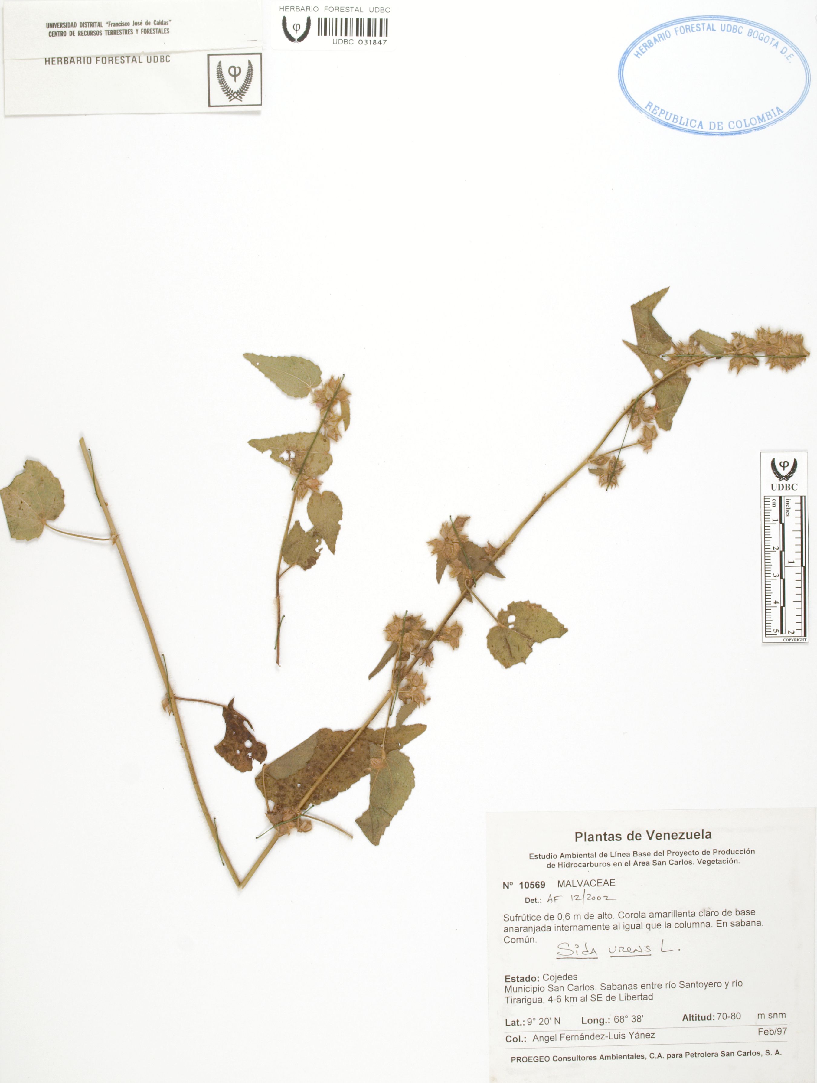 Fotografía del ejemplar Fernández, A. 10569, determinado como Sida urens en el año 2002