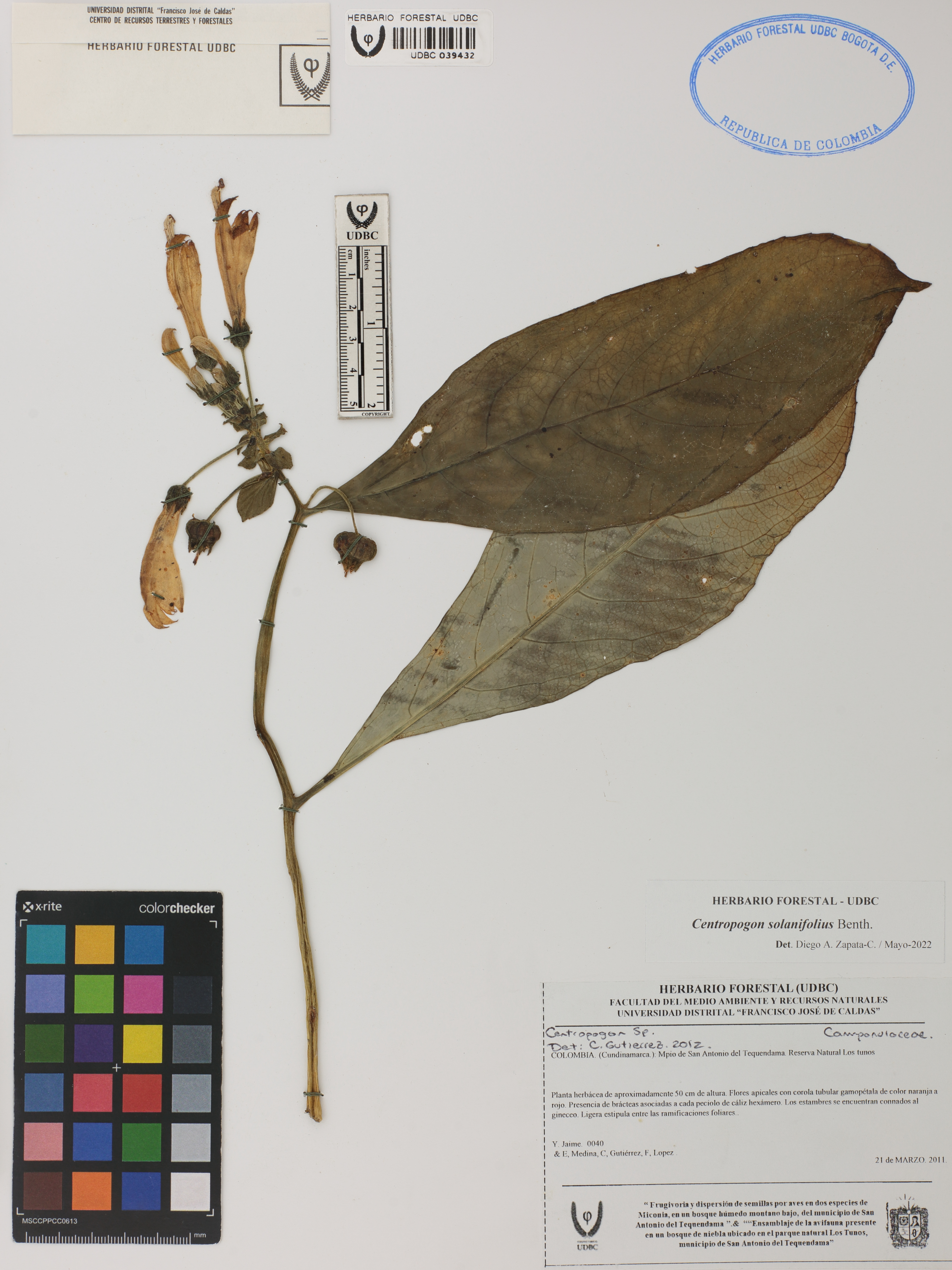 Fotografía del ejemplar Jaime, Y. 40, determinado como Centropogon solanifolius en el año 2022