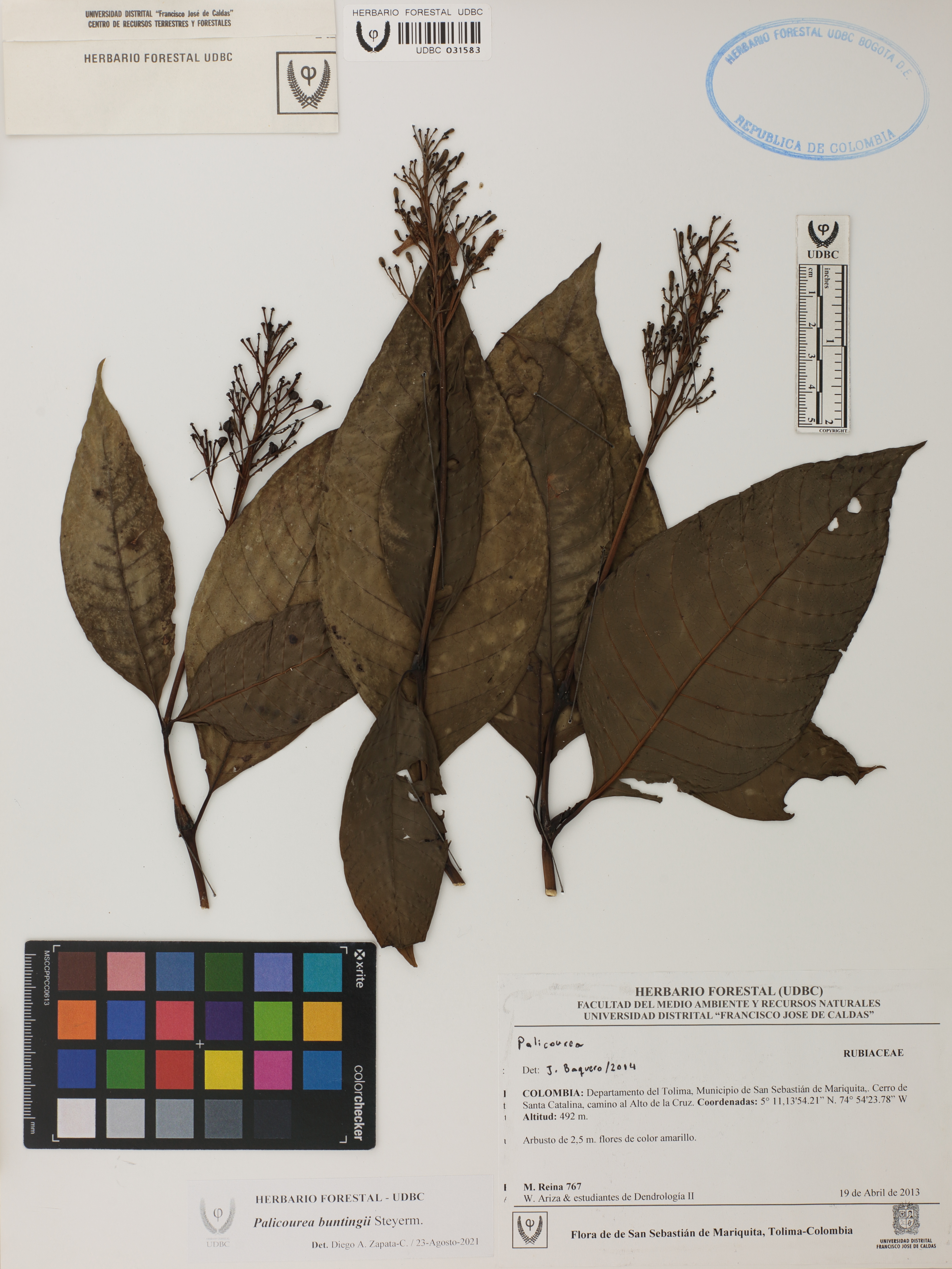 Fotografía del ejemplar Reina, M. 767, determinado como Palicourea buntingii en el año 2021